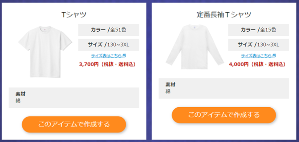 価格 :Tシャツ1枚1,100円(税込み)から ※プリント代込み、100枚以上まとめて割適用