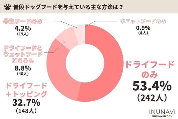 普段ドッグフードを与えている主な方法で最も多かったのは「ドライフードのみ」53.4%でした。