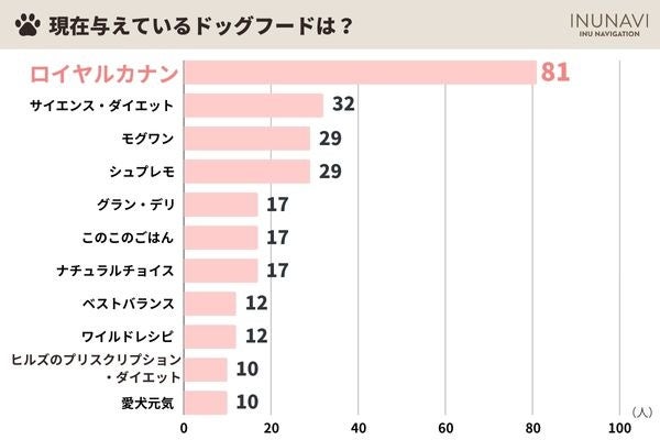 現在与えているドッグフードで最も多かったのは「ロイヤルカナン」81人でした。