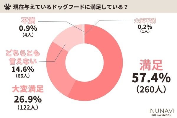 現在与えているドッグフードの満足度で最も多い回答は「満足」57.4%でした。