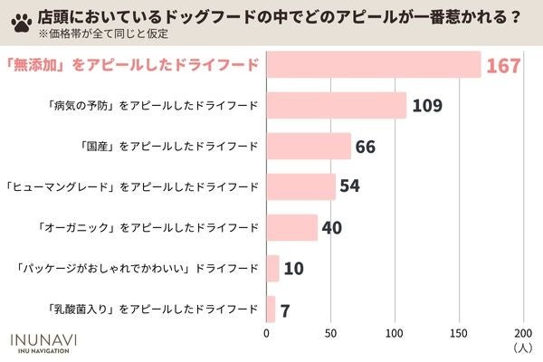 ・店頭に並ぶドッグフードで価格帯が同じなら惹かれるアピールで最も多い回答は「無添加」167人と、できれば添加物を与えたくないという心理が見える