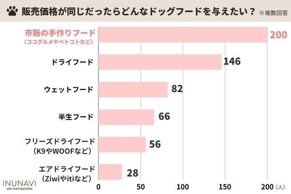 販売価格が同じだったら与えたいドッグフードは「市販の手作りフード」が200人と最多