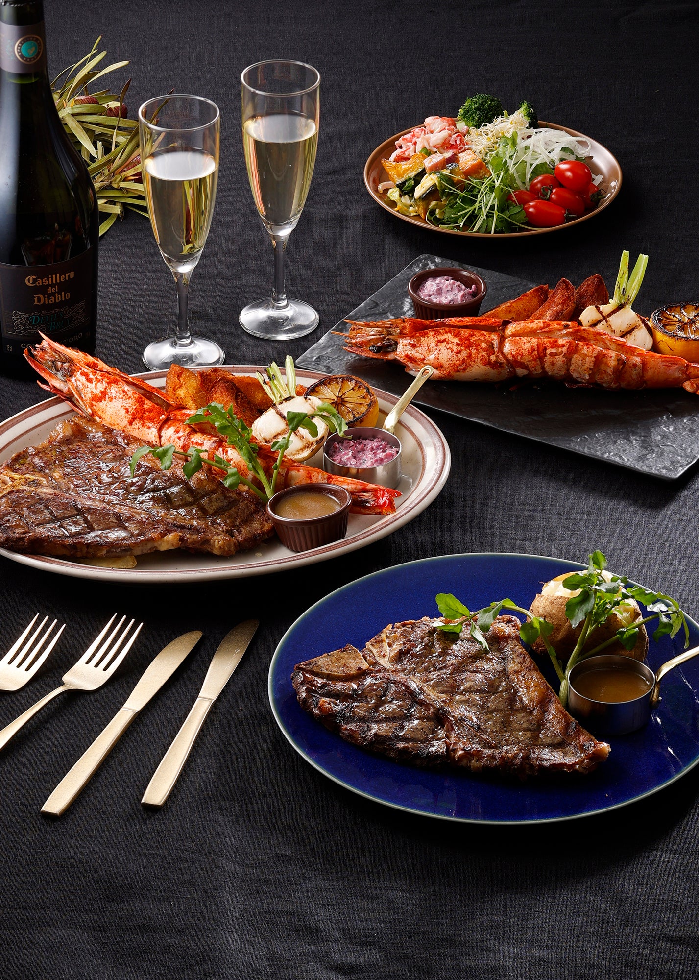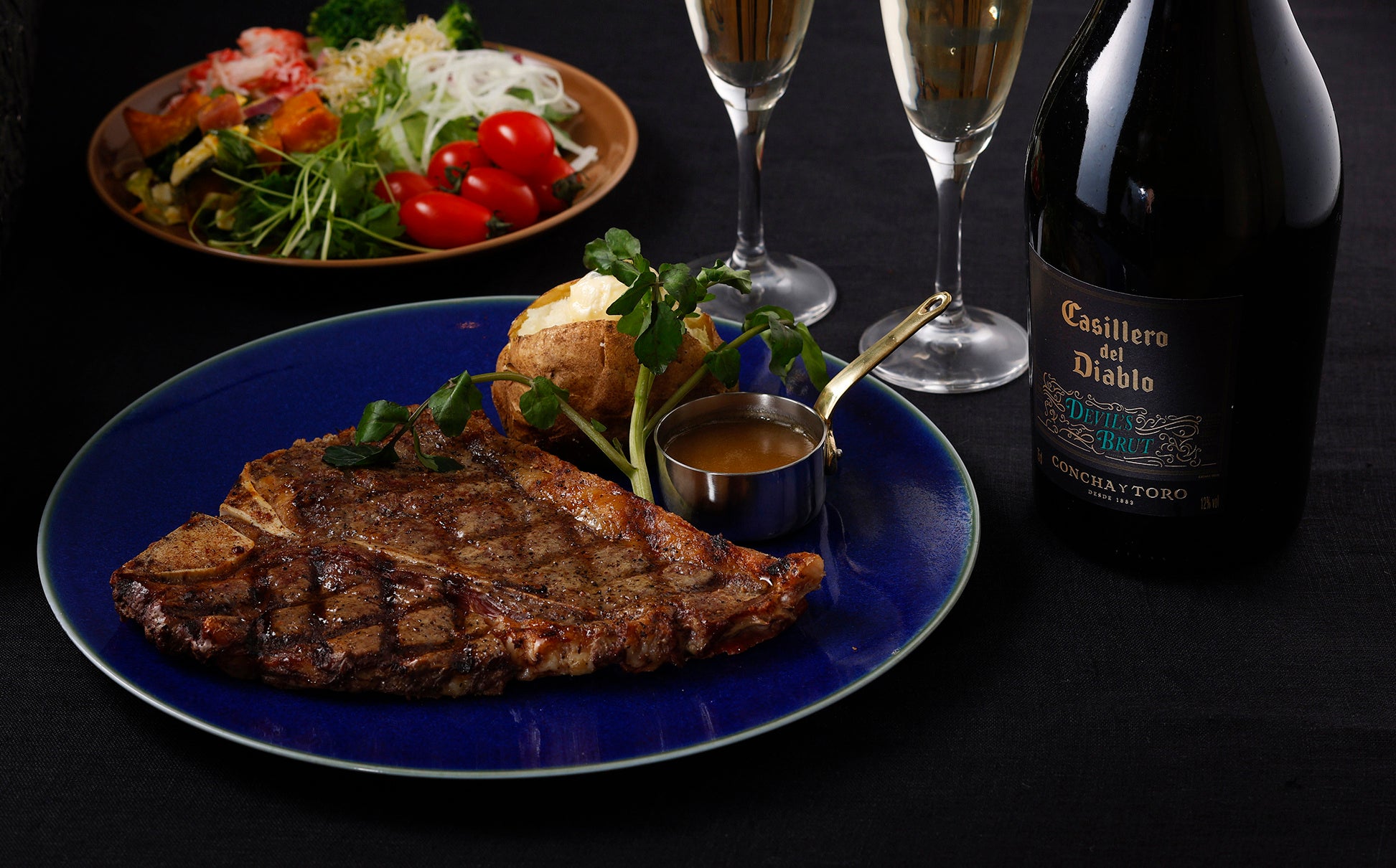 - 「Tボーンステーキ」、サラダバーにスパークリングワイン(フルボトル)も楽しめて2名様1万円の嬉しいセットも