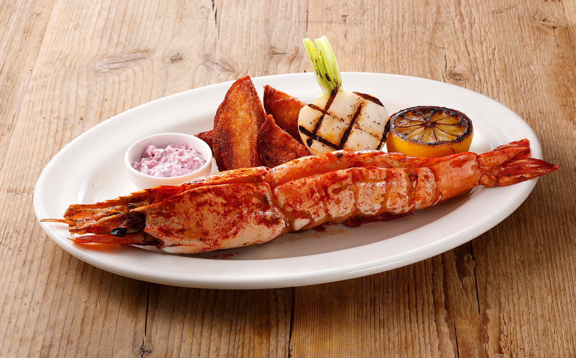 クセがなく柔らかな肉質の豪州産ヤングビーフ(概ね24か月の若齢牛肉)のTボーンは、"サーロイン"と"ヒレ"がT字の骨を挟んで向かい合う贅沢な骨付きステーキです。素材の風味を存分にお楽しみいただくためシンプルにグリルしました。また、「シータイガー」は、海で捕獲された天然の大海老(ブラックタイガー種)で、しっかりとした肉質と濃厚な甘みが特徴です。殻付きのまま焼き上げたシータイガーは、そのままでも海老の香ばしい風味と食感をお楽しみいただけます。さらにはグリルレモンを絞って、そして色鮮やかなしば漬け入りの「ビオレタルタル」をつけて、と味の変化をご堪能いただける商品です。「Tボーンステーキ」は400g以上、「シータイガー」も大ぶりのため、見た目にもお腹にも大満足のグリルです。