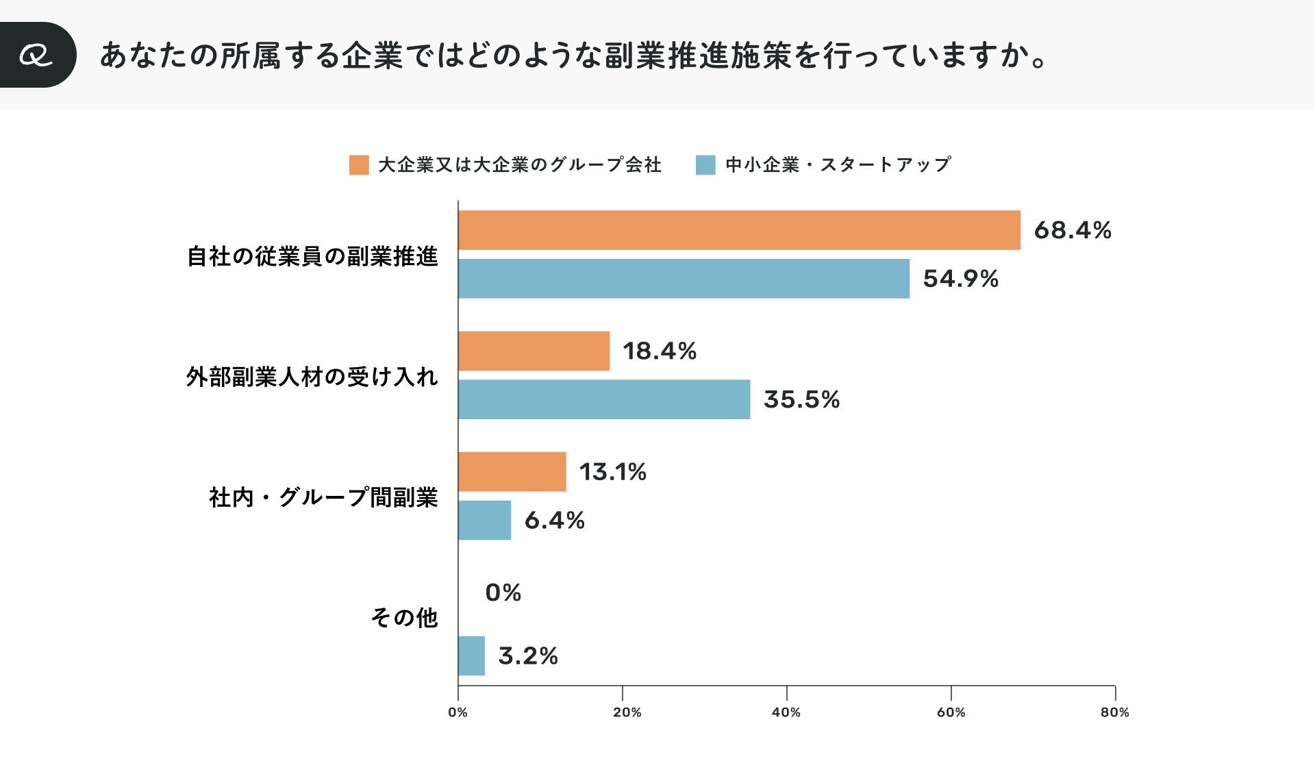「大企業(39.9%)」または「中小企業・スタートアップ(60.1%)」で経営者、人事、経営企画などに携わる方々を対象に、 「あなたの所属する企業ではどのような副業推進施策を行っていますか。」と尋ねたところ、大企業、中小企業・スタートアップともに 「自社の従業員の副業推進」が最も多く、次いで「外部副業人材の受け入れ」という結果となりました。「働き方改革」や「(従業員の)収入の補助」などを理由に副業解禁に踏み出す企業が多い(※)一方で、外部人材(副業人材)を受け入れる取り組みは、大企業よりもスタートアップや中小企業で積極的に推進されている現状が伺えました。