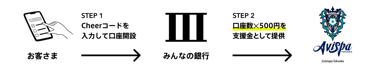 口座開設時に下表に記載のCheerコードを入力すると、支援金として500円がみんなの銀行からアビスパ福岡に届けられ、さらには応援特典として開設されたお客さまの口座(貯蓄預金)にも500円が入金されます。