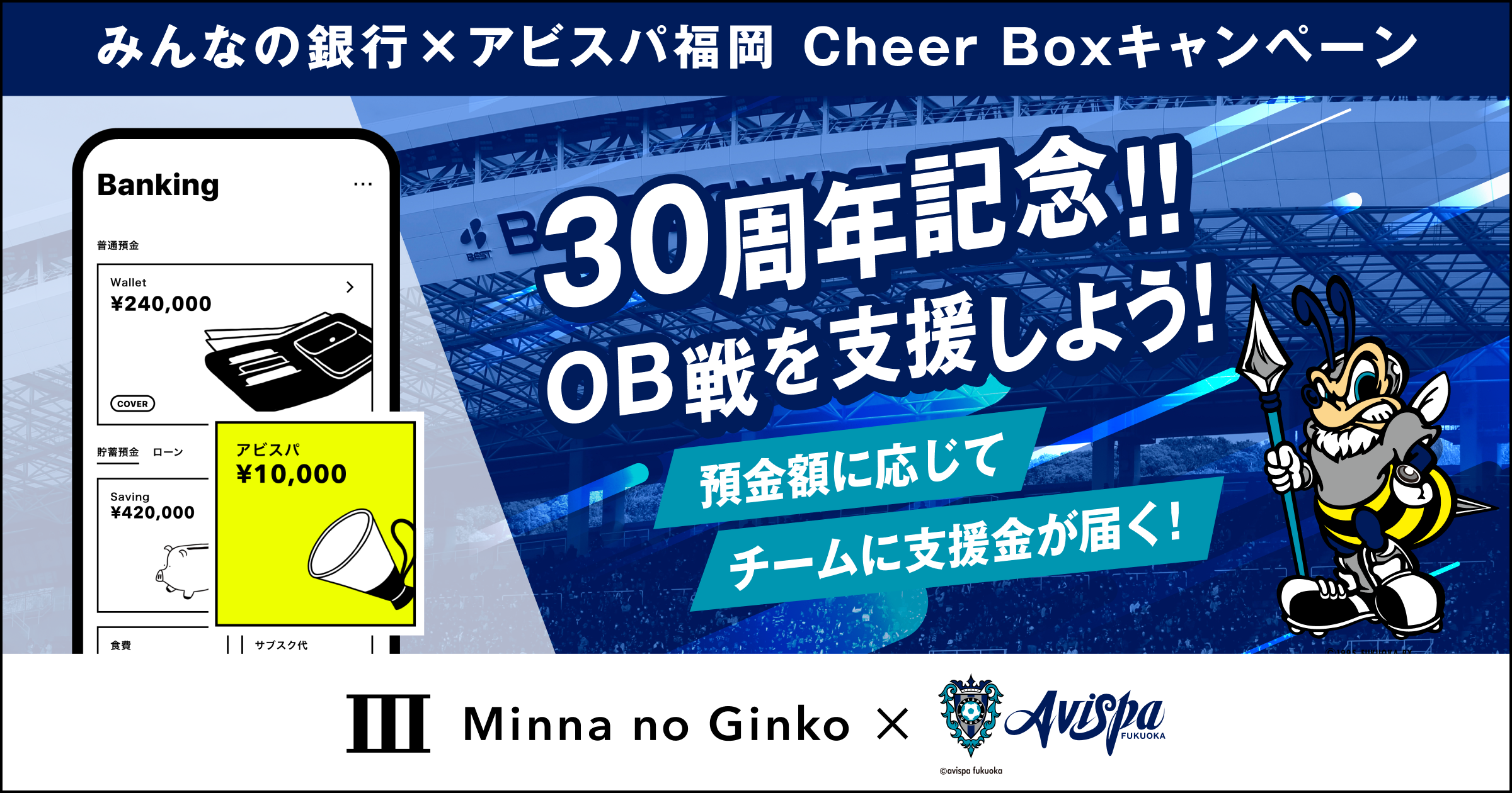 株式会社みんなの銀行(取締役頭取 永吉 健一、以下「みんなの銀行」)は、アビスパ福岡株式会社(代表取締役社長 結城 耕造)が運営するJリーグクラブであるアビスパ福岡と、2022~2024シーズンに引き続き、 2025シーズンもオフィシャル・パートナー契約を締結しました。みんなの銀行では、ファンとアビスパ福岡を”つなぐ”「アビスパ福岡Cheer Box」および「アビスパ福岡Cheerコード」を通じて、クラブ創設30周年を記念した「OB戦」の開催を支援する「Cheer Boxキャンペーン」を実施します。