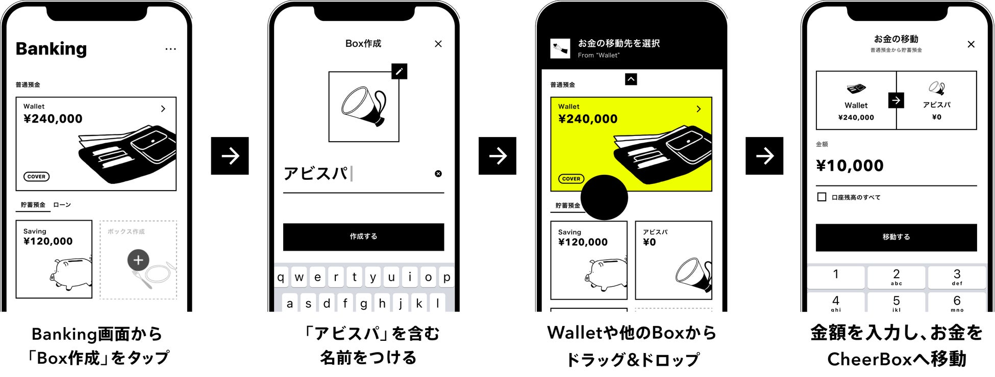 Cheer Boxは、みんなの銀行アプリを通じて提供する目的別の貯蓄機能である「Box」を活用して、皆さまの「応援の気持ち」をチームやコミュニティの活動支援に“つなぐ”仕組みです。