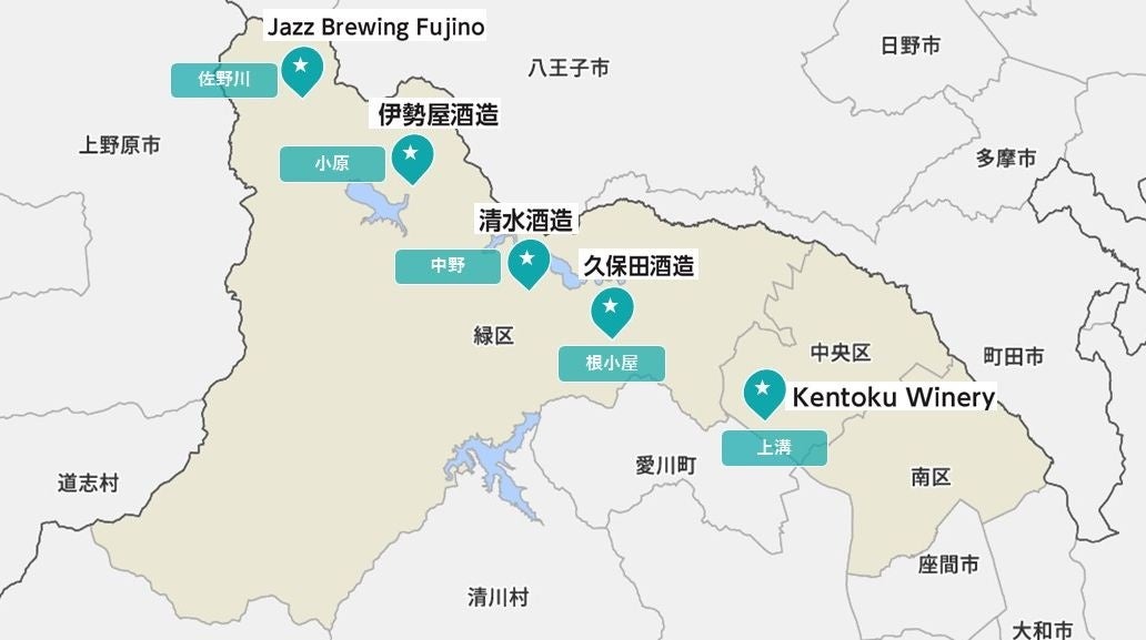 奇しくも今回参加した酒造メーカー5社の拠点は、地図上であたかも一直線上に並ぶような立地で、そのラインを結ぶ一本道や河川はないながらも、それはさながら「相模原酒造街道」と呼べるかもしれません。