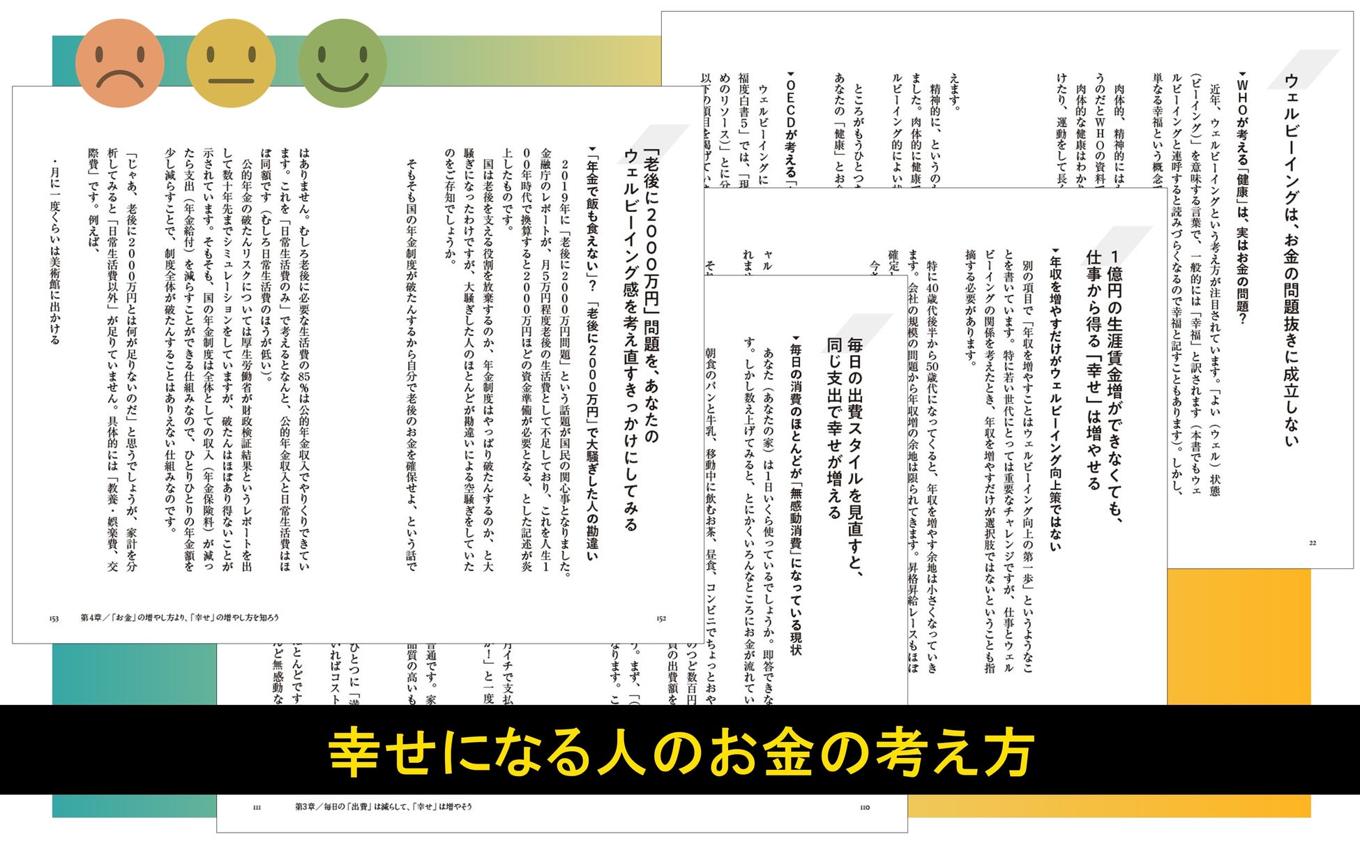 従来のお金の本は、増やすことや削ることばかりをテーマとしてきましたが、そこにある「本人の喜び」や「幸福度」はおざなりにされてきました。本書では、人生の「満足感」を上げるヒントを紹介します。