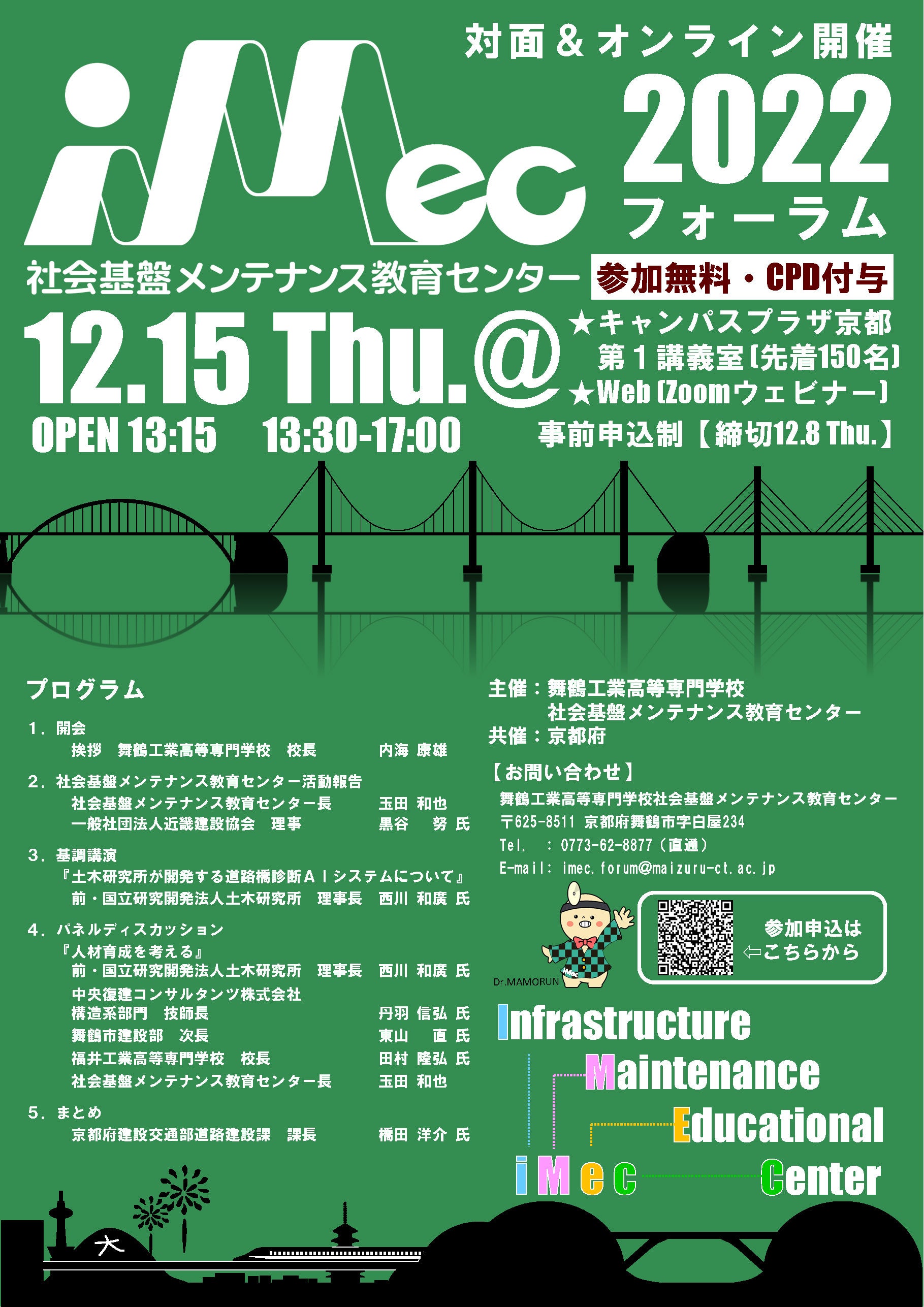 舞鶴工業高等専門学校(京都府舞鶴市 校長:内海 康雄)社会基盤メンテナンス教育センター(略称iMec,センター長:建設システム工学科教授 玉田和也)は、産官学が集いインフラメンテナンスについて学びあう「iMecフォーラム2022」を2022年12月15日(木)に対面・オンライン併用で開催します。今年度は、基調講演者に前・国立研究開発法人土木研究所理事長の西川和廣様を迎え、『土木研究所が開発する道路橋診断AIシステムについて』と題してご講演いただきます。また、パネルディスカッション『人材育成を考える』では、産官学のパネリストにより、行政を含む建設業界全体の人的資本形成へ向けた議論を展開します。