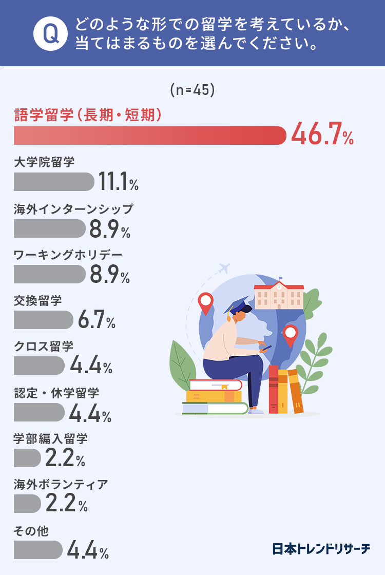 46.7%と、やはり「語学留学」を考えている方が多いようです。