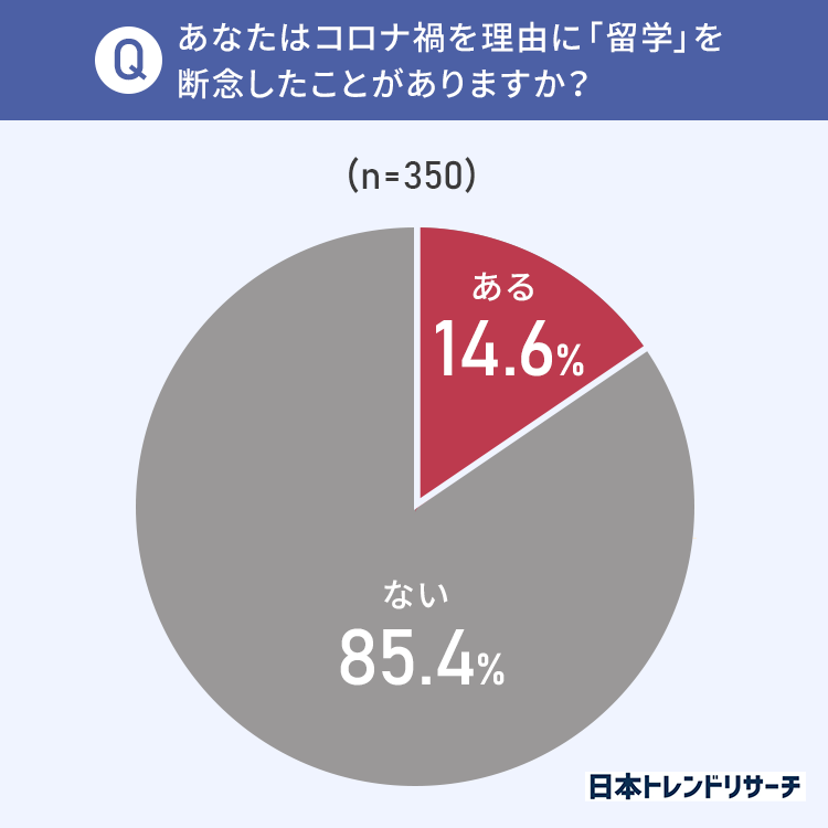 学生350人のうち、14.6%がコロナ禍を理由に留学を断念したことが「ある」と回答しました。