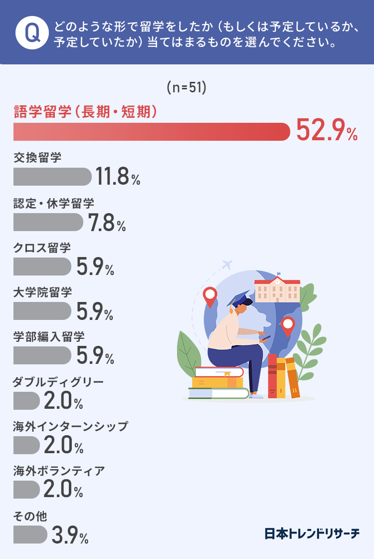52.9%の方が「語学留学」と回答し、もっとも多い結果になりました。