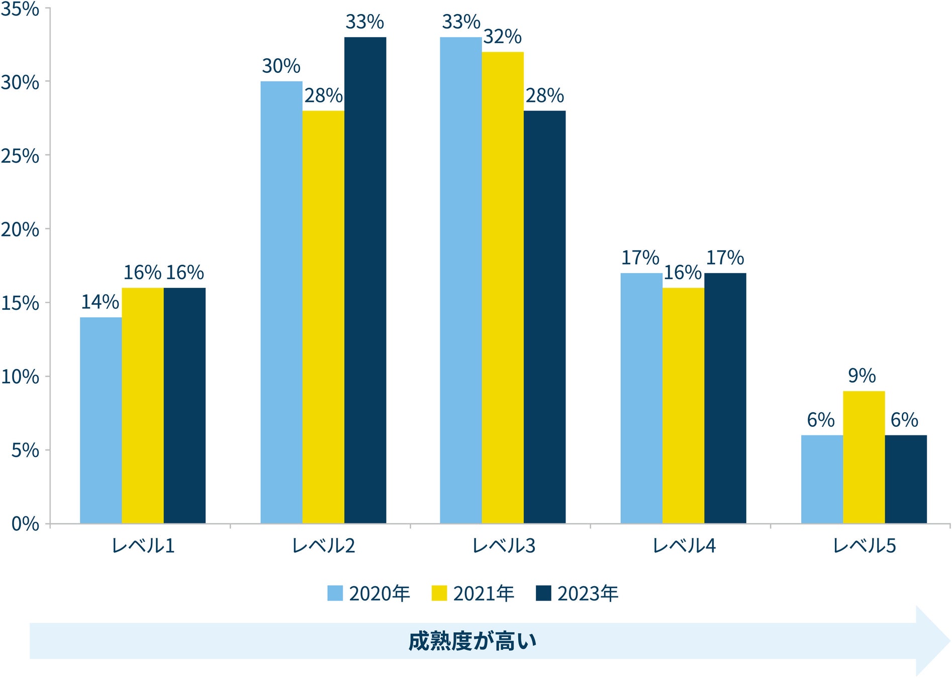 各レベルに分類された回答者の数には変動がみられ、特にレベル2の回答者が28%から33%に増加しましたが、レベル3は32%から28%に減少しています。また、約半数の組織が基本的なプログラムのみを利用している低成熟度組織(レベル1およびレベル2)との回答となりました。