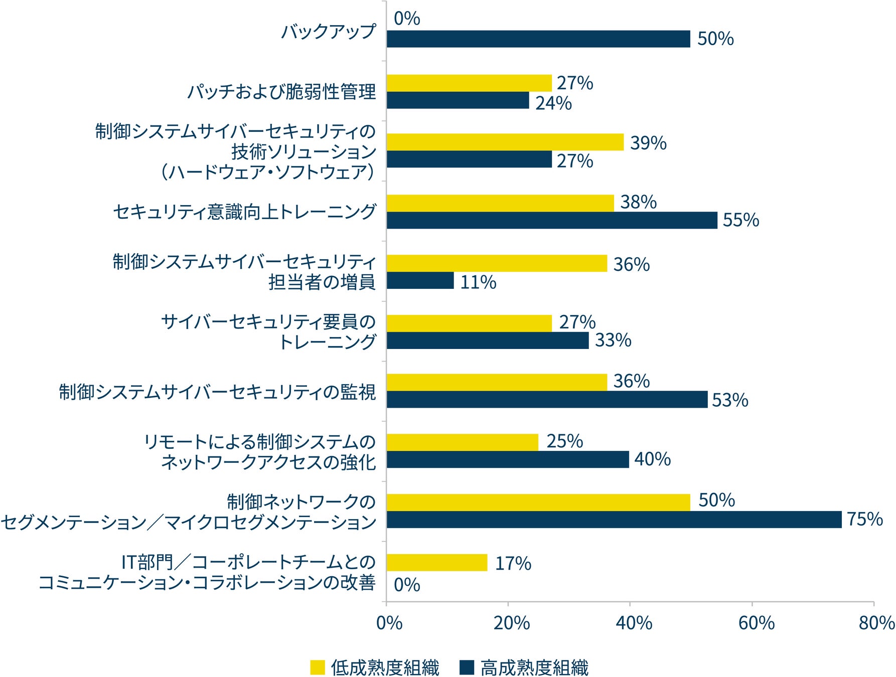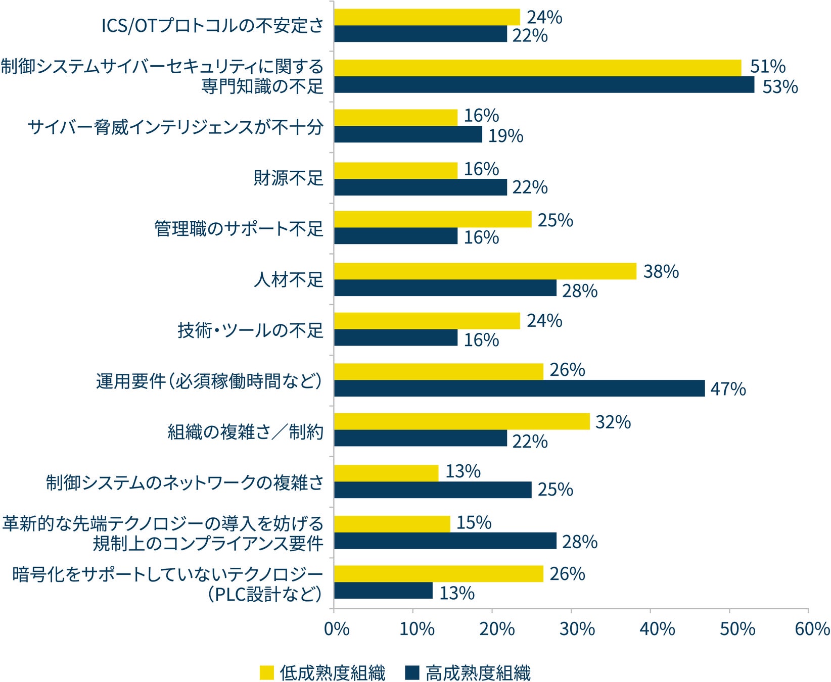 両組織ともに「制御システムサイバーセキュリティに関する専門知識の不足」(低成熟度組織:51%、高成熟度組織:53%)が、最も多い結果となりました。一方で、 「管理職のサポート不足」(低成熟度組織:25%、高成熟度組織:16%)や「暗号化をサポートしていないテクノロジー」(低成熟度組織:26%、高成熟度組織:13%)など、高成熟度組織と比較して低成熟度組織の回答割合が高い項目は、高成熟度組織にとって既に克服したハードルであることを示しています。