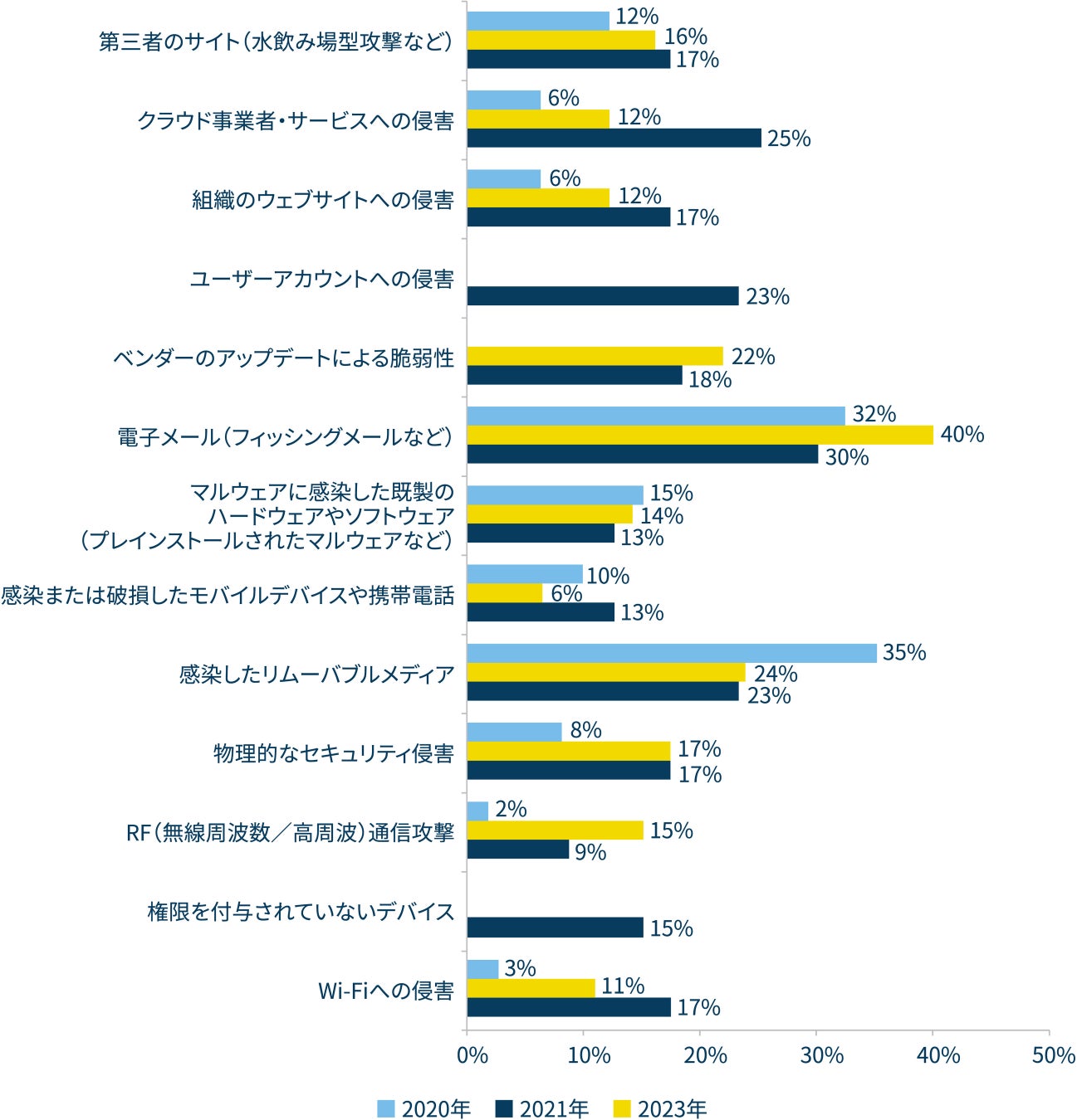 全世界における各攻撃ベクトルの頻度について分析しました。前回までの結果と比較すると、複数の項目で明確な増加がみられました。「クラウド事業者・サービスへの侵害」(2020年:6%、2023年:25%)、「組織のウェブサイトへの侵害」(2020年:6%、2023年:17%)および「Wi-Fiへの侵害」(2020年:3%、2023年:17%)の回答割合が継続して増加しています。また、攻撃者はフィッシングにとどまらず、標的とする攻撃対象領域以外の部分にも拡大しているとの脅威に関する調査報告を裏付けています。