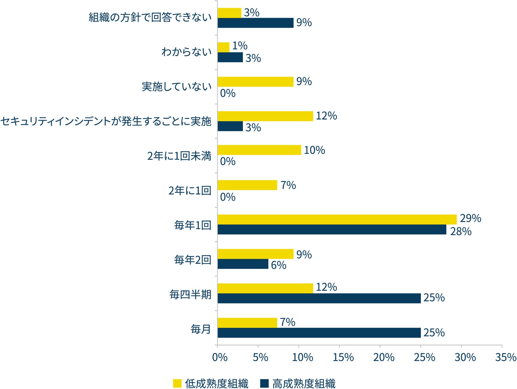 高成熟度組織の半数が少なくとも四半期に1回アセスメントを実施している一方、低成熟度組織の半数以上は毎年1回以下の実施にとどまっています。また、低成熟度組織では「セキュリティインシデントが発生するごとに実施」が「毎四半期」と並び2番目に多い項目で、インシデントが起きてから対応している傾向がみられます。なお、低成熟度組織の9%がセキュリティアセスメントを実施していないと回答しています。