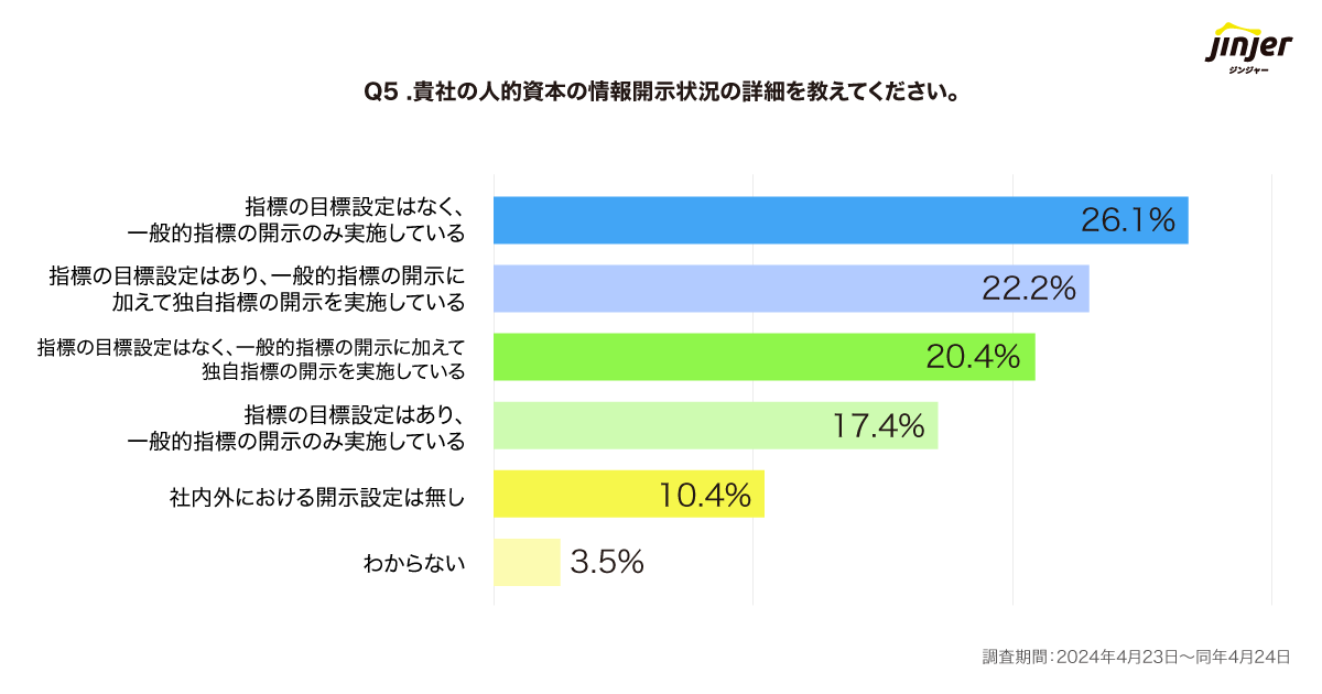 実際に人的資本の情報開示状況の詳細について聞いたところ、「指標の目標設定はなく、一般的指標の開示のみ実施している」と答えた企業が26.1%だった。次いで「指標の目標設定はあり、一般的指標の開示に加えて独自指標の開示を実施している(22.2%)」、「指標の目標設定はなく、一般的指標の開示に加えて独自指標の開示を実施している(20.4%)」だった。