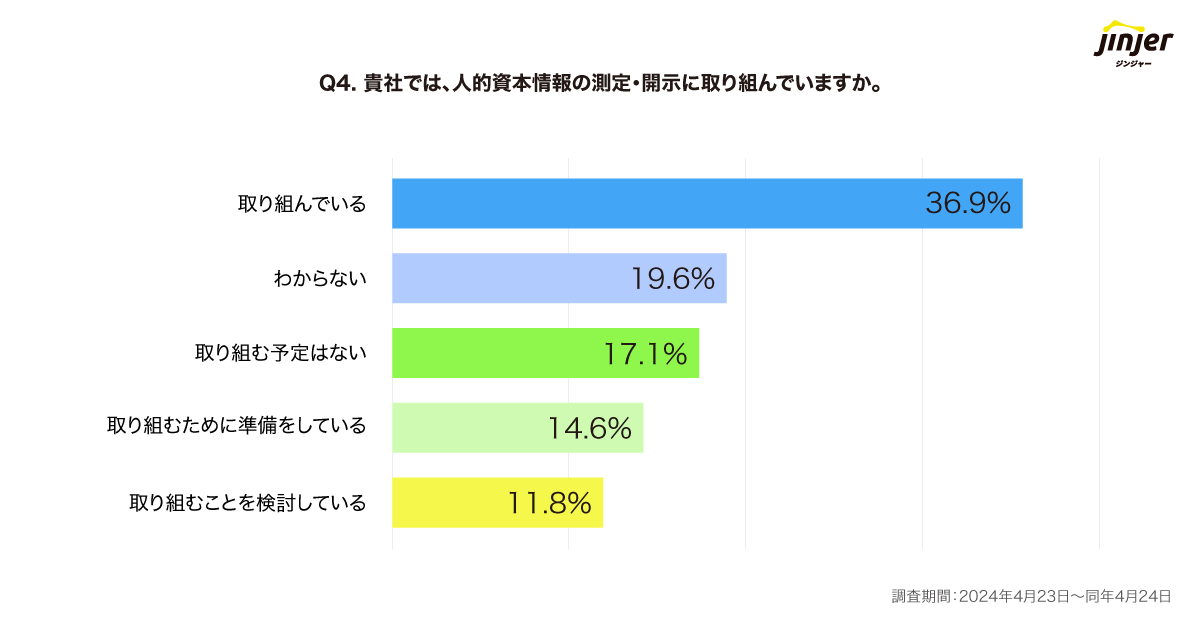 人的資本情報の測定・開示に取り組んでいる企業は40%弱。約20%弱は「取り組む予定がない」と回答。