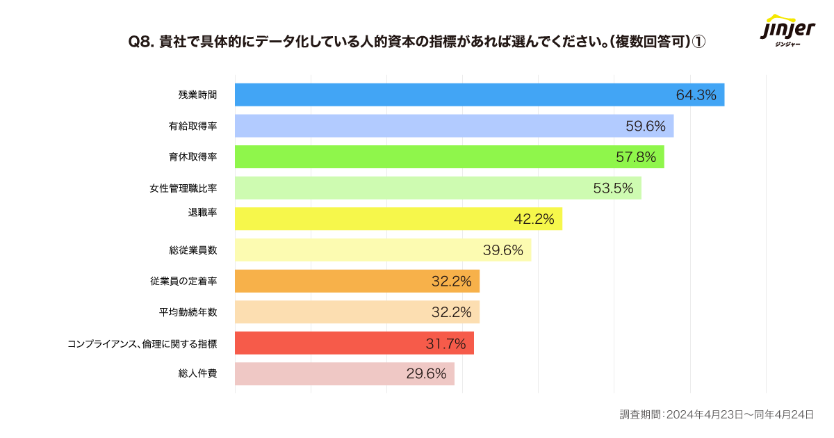 具体的にデータ化している人的資本の指標を聞いたところ、1位「残業時間(64.3%)」、2位「有給取得率(59.6%)」、3位「育休取得率(57.8%)」と、勤怠にかかわる情報が最も多いことがわかりました。次いで多い指標は「女性管理職比率(53.5%)」、「退職率(42.2%)」、「総従業員数(39.6%)」と、人に関する情報について、データ化を進めている企業が多くみられました。