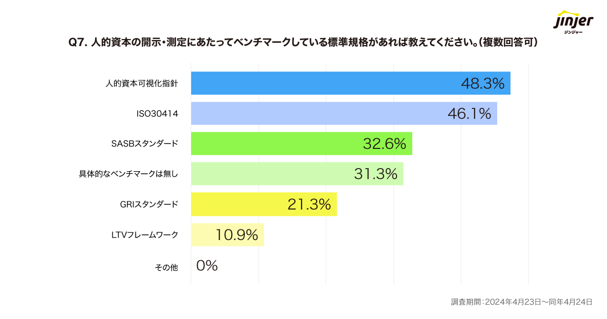 また、人的資本の開示・測定にあたってベンチマークしている標準規格について聞いたところ、最多回答は「人的資本可視化指針(48.3%)」でした。次いで「ISO30414(46.1%)」、「SASBスタンダード(32.6%)」という結果になりました。
