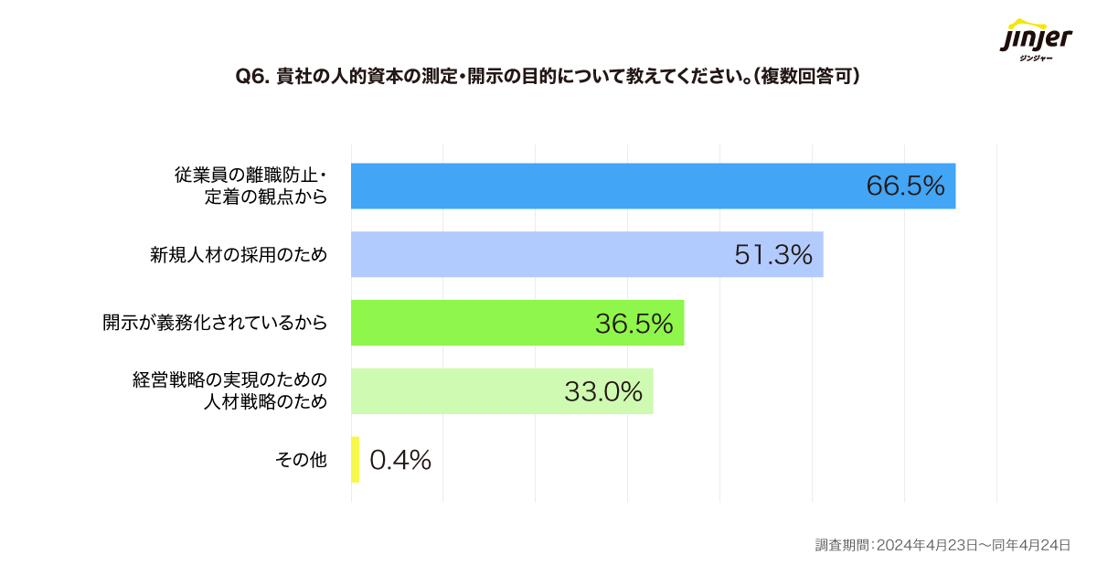 人的資本の測定・開示の目的について質問したところ、最多回答は「従業員の離職防止・定着の観点から(66.5%)」だった。次いで「新規人材の採用のため(51.3%)」、「開示が義務化されているから(36.5%)」、「経営戦略の実現のための人材戦略のため(33%)」という結果だった。