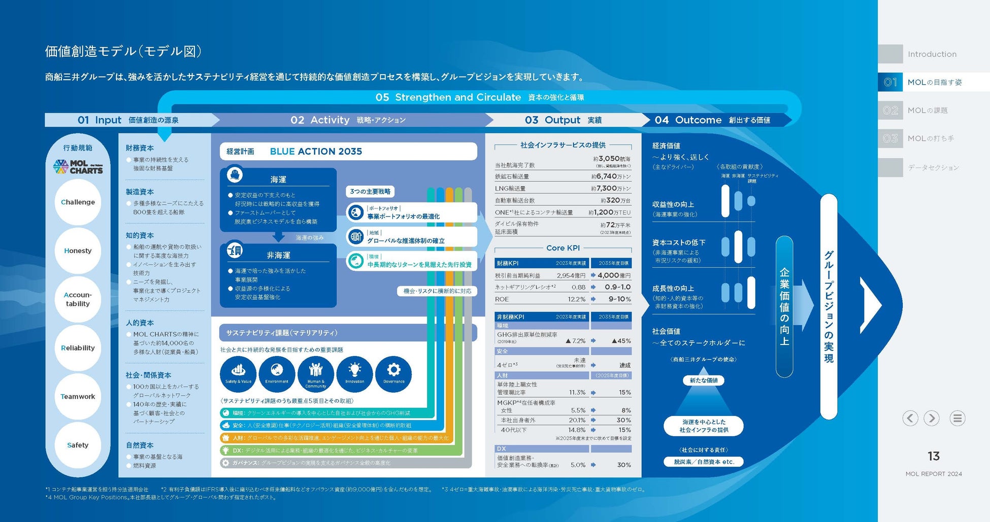 本レポートは、株主および投資家をはじめとしたステークホルダーの皆様に、商船三井グループ経営計画「BLUE ACTION 2035」を基盤に、当社グループが目指す姿、実現に向けた課題、ならびに課題への打ち手を、同計画の実行開始から1年を経ての進捗とともに、一層理解していただくことを目指して制作しました。また、2024年に創業140周年を迎え、当社グループの経営のありたい姿を再整理し、グループビジョンを実現するための「価値創造モデル」(下図、レポート内P13)を更新しました。