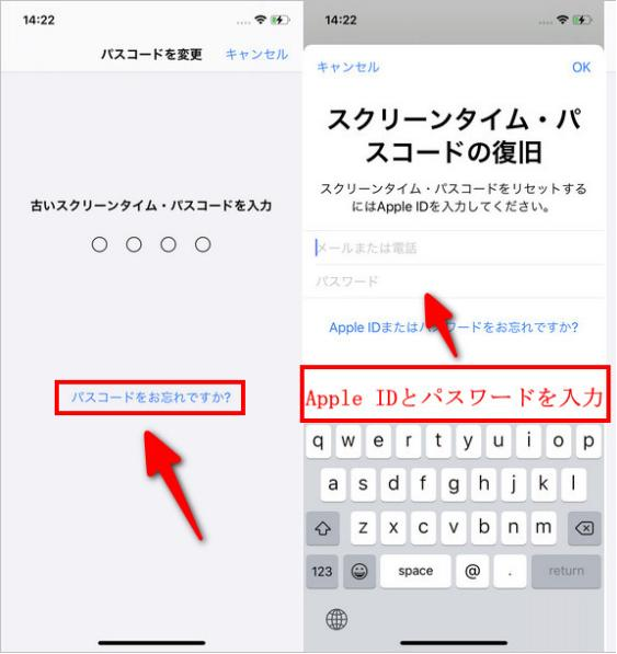 Step3:「パスコードをお忘れですか?」をタップしてApple ID とパスワードを入力します。