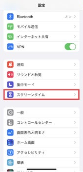 Step1:「設定」から「スクリーンタイム」を開きます。