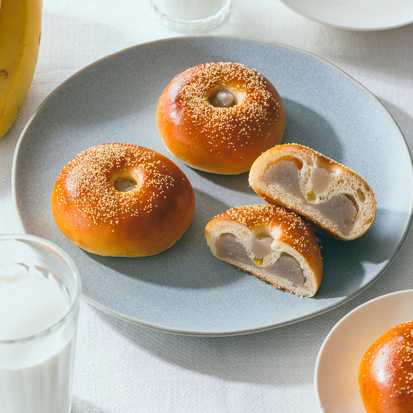 完熟バナナの濃厚な甘みに牛乳のミルキーさが加わったなめらかなバナナあんを、酒種生地で包みました。(宮崎県産完熟バナナ使用)