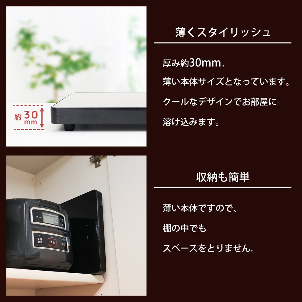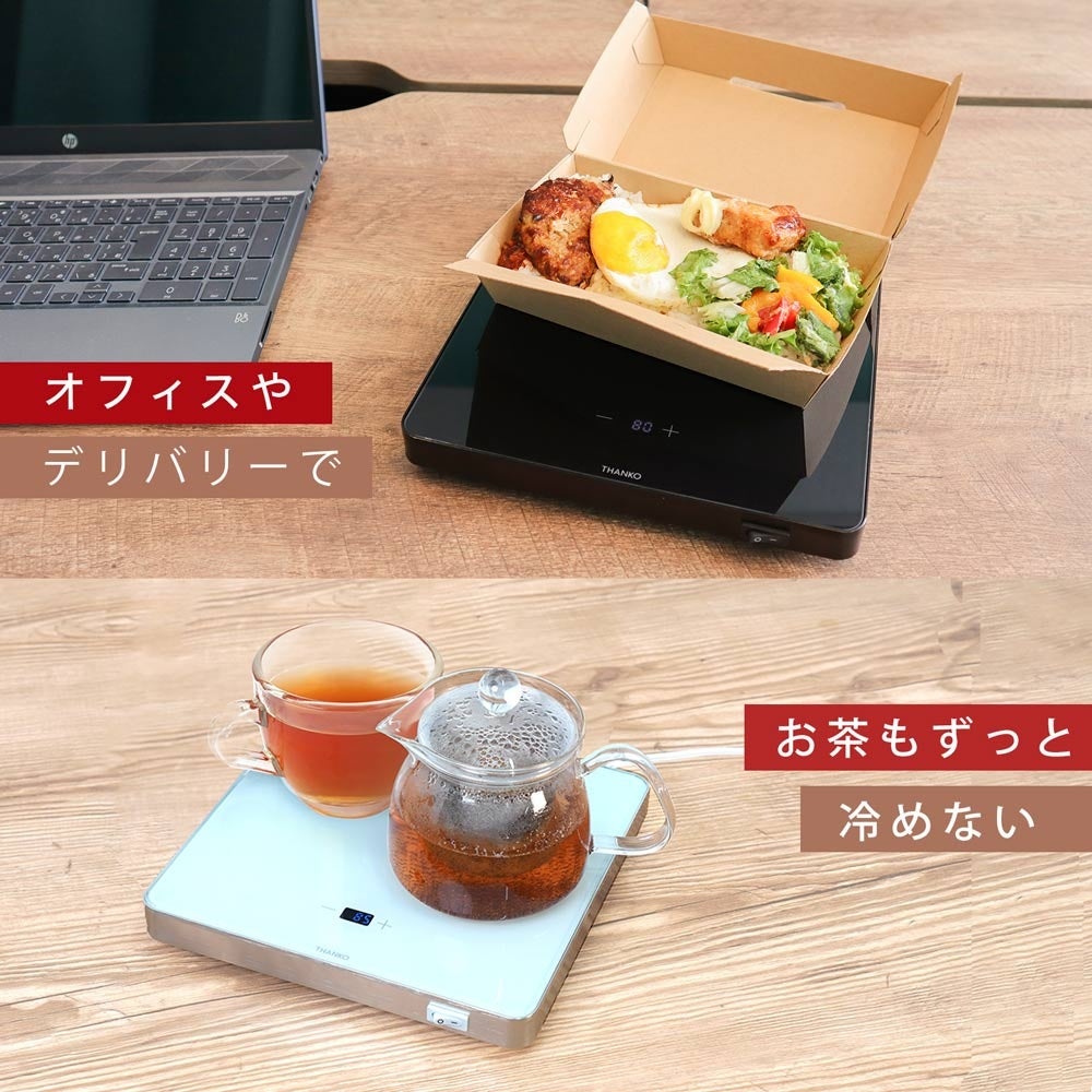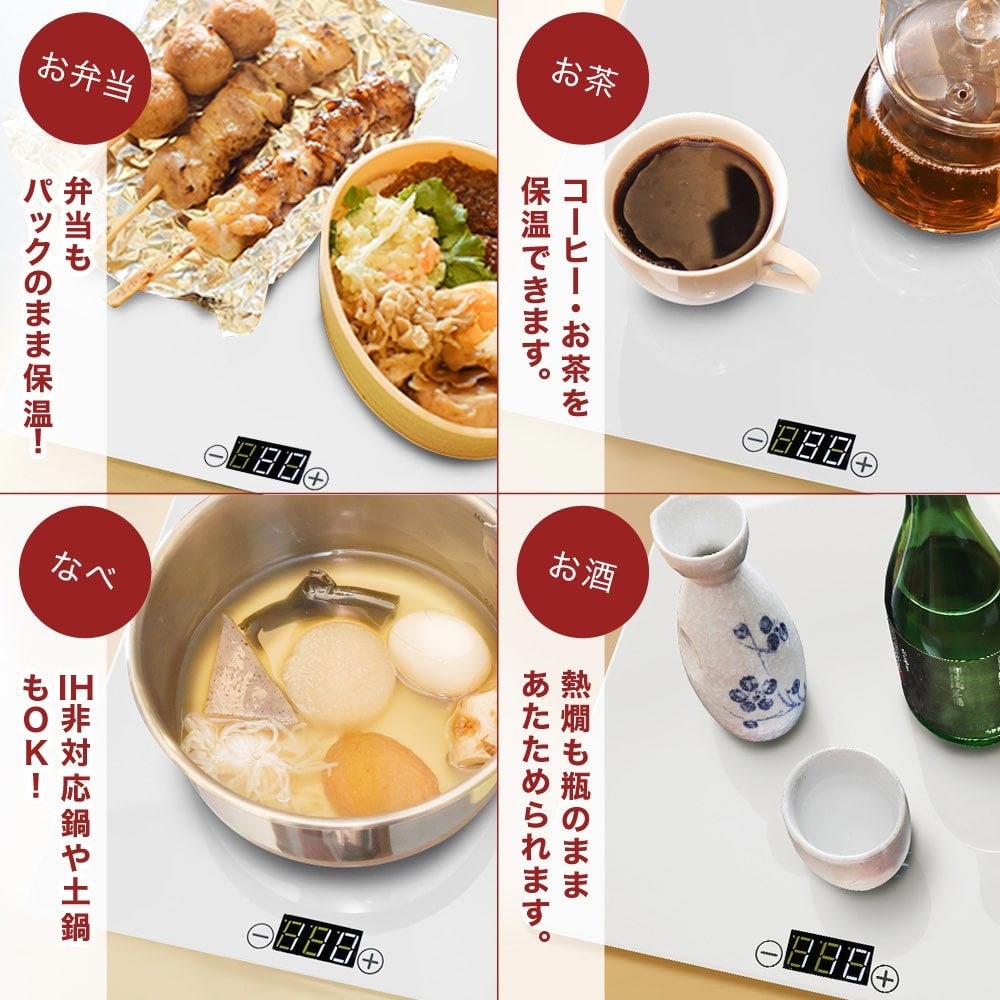 プレート内部にヒーターを搭載し、プレートに置いたもの直接温めて、冷めずに美味しい温度で保温することができます。IH方式でないためIH非対応の鍋でも使用可能。お惣菜やテイクアウトしたたこ焼きを容器ごと置いて時間がたってもアツアツでお召し上がりいただけます。食べ物以外にもコーヒーサーバーやカップなども保温できます。料理後の鍋を置けば火を使わず温かいまま保温できます。