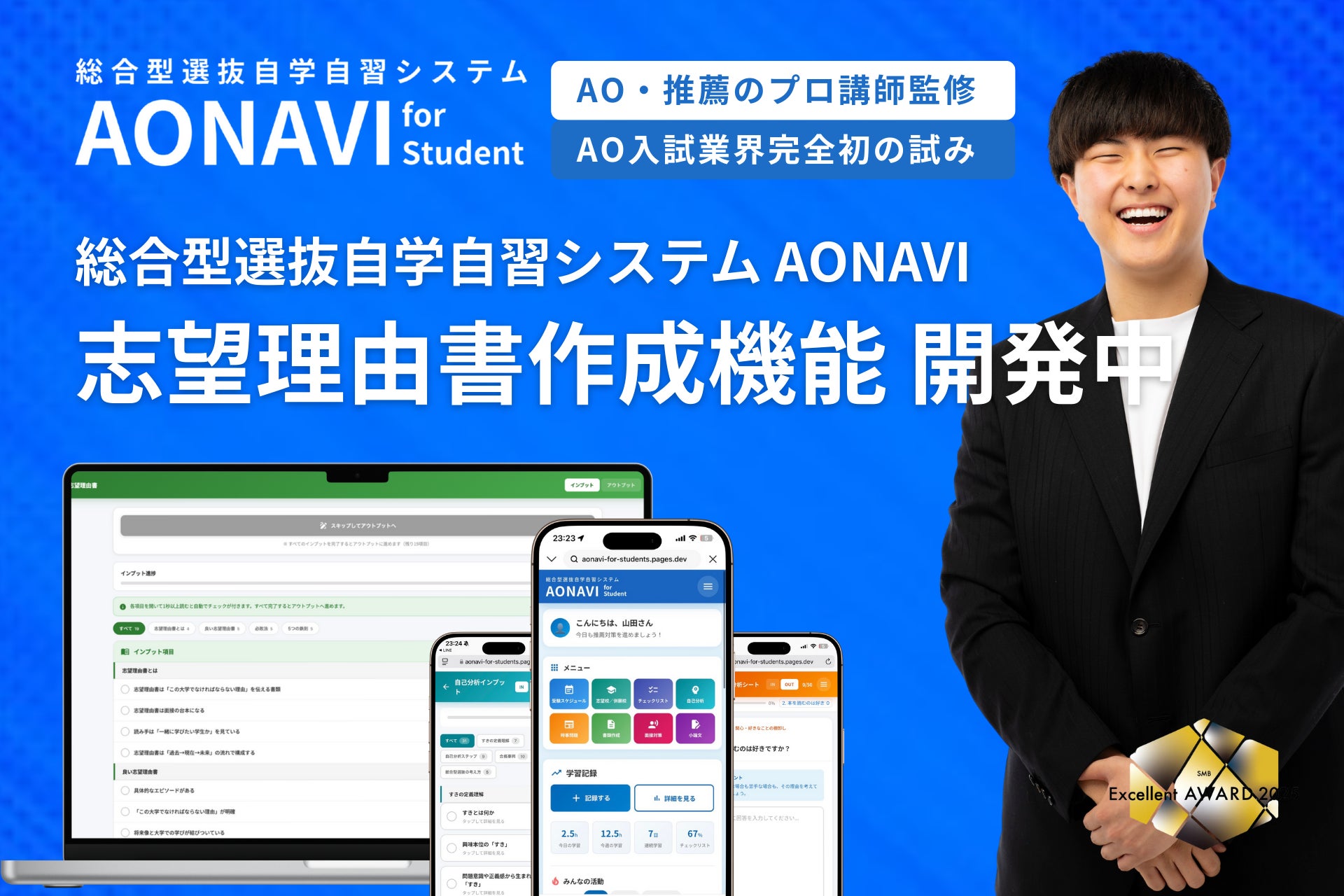 【総合型選抜 志望理由書作成をDX化】AONAVI 志望理由書作成ツールを開発中AI任せではない“教育型設計”で作成・添削・履歴管理まで一元化。総合型選抜の専門家が開発した志望理由書作成ツール