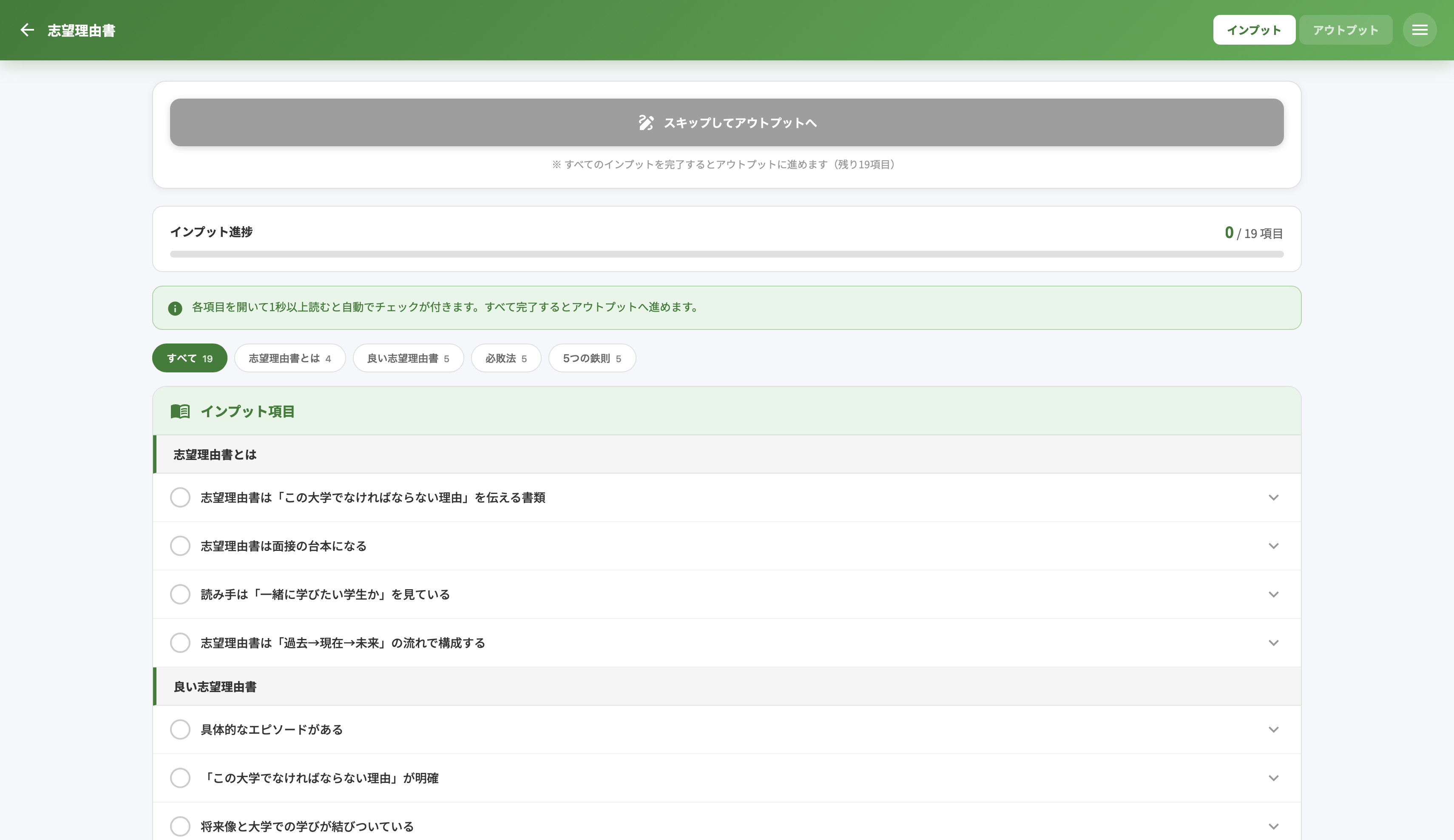 志望理由書作成に必要な知識、考え方、注意点をチェックリスト形式で学習。