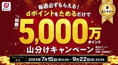 本キャンペーンの参加にはキャンペーンサイトからエントリーが必要で、対象のdポイント加盟店にて1週間あたり100円(税込)以上のお買い物でdポイントをためていただくと、その週の山分け進呈対象となります※3※4。毎週月曜日~日曜日で500万ポイントが山分けとなり、キャンペーン期間中(10週間)の合計で総額5,000万ポイントが山分けされます。毎週対象条件を満たしていただくことで、毎週山分け対象となります。進呈上限は、お1人さま100ポイント/週となります。キャンペーン詳細はキャンペーンサイトにてご確認ください。