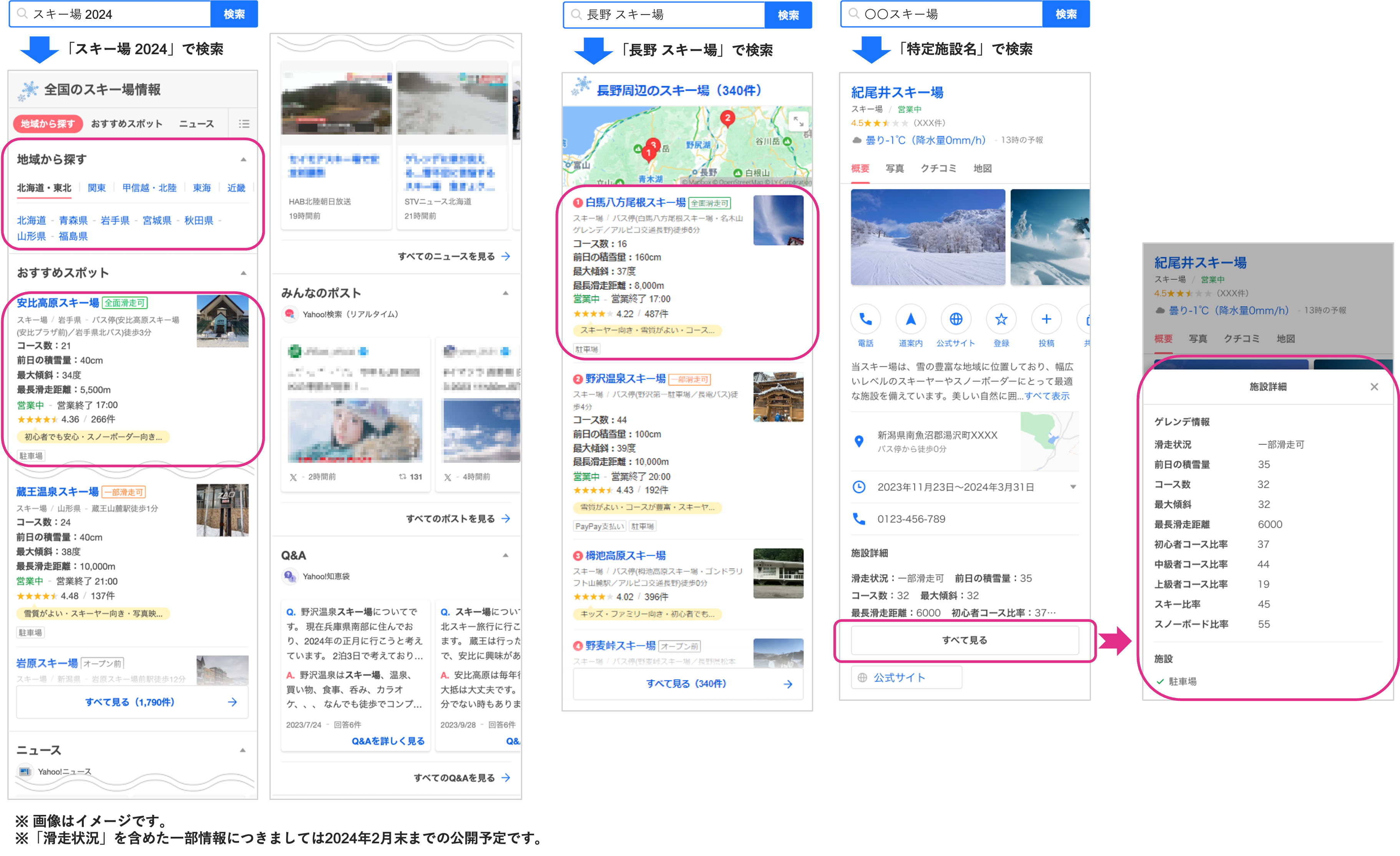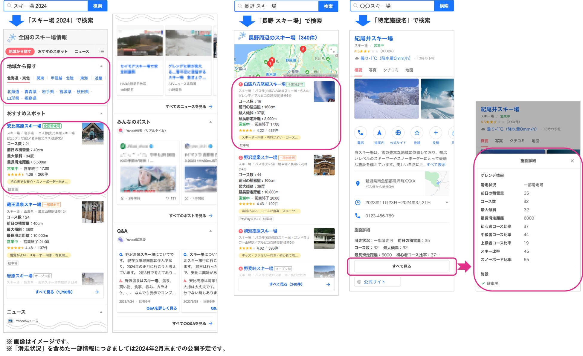 「Yahoo!検索」では、ゲレンデに関連するキーワードで検索すると(例:「スキー場 2024」)、ゲレンデ別に「アクセス」「営業状況」「レビュー」に加えて、「滑走状況」「コース数」「前日の積雪量」「最大傾斜」「最長滑走距離」が検索結果面に表示されます。また、「都道府県名」と合わせて検索すると(例:「長野 スキー場」)、地域別にゲレンデが一覧で確認できます。