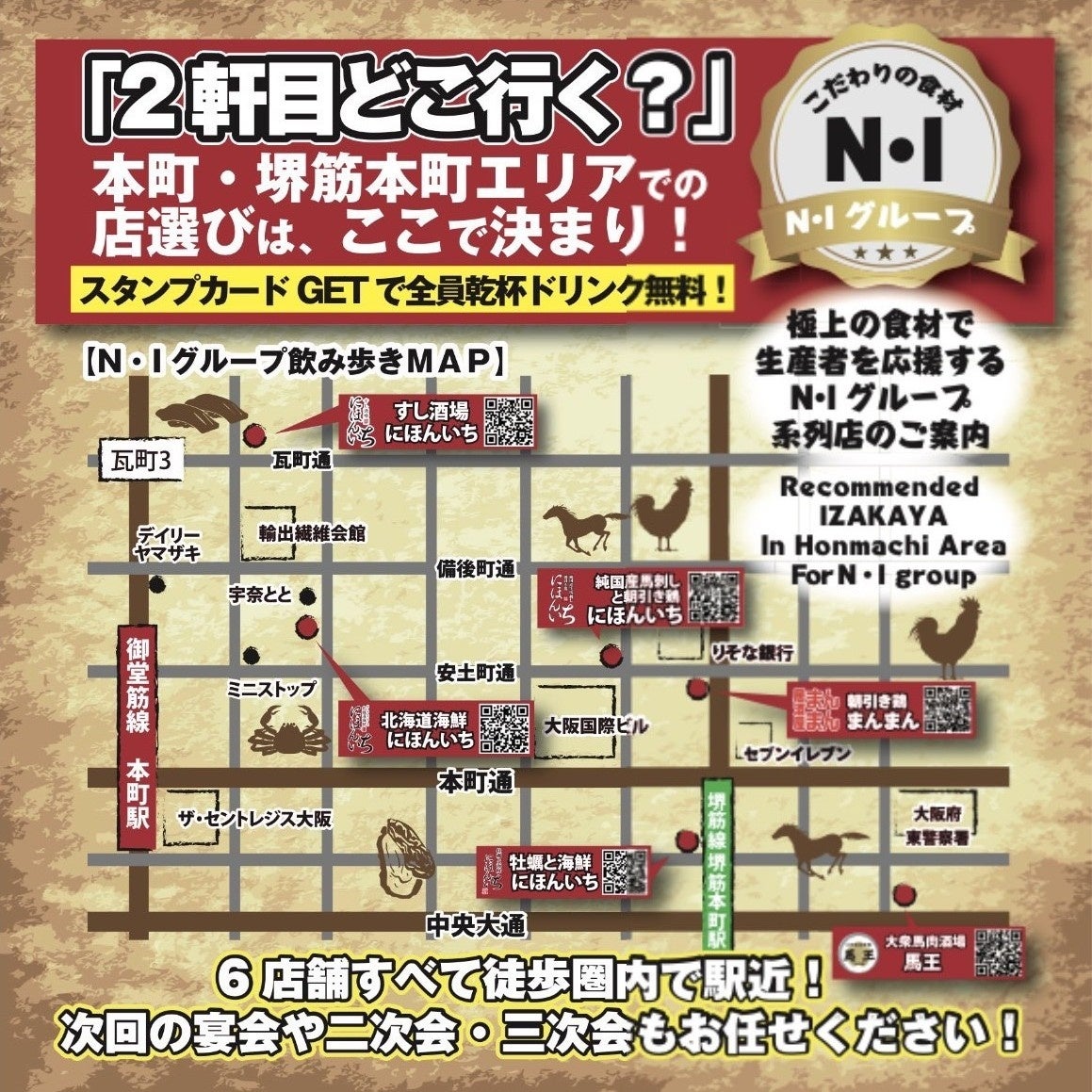 株式会社N・I(本社:大阪市淀川区/代表取締役:河村則夫)は、2026年4月15日(水)より、本町・堺筋本町エリアに展開する系列飲食店にて、徒歩で複数店舗を巡りながら楽しめる「ハシゴ酒スタンプ企画」を開始しました。寿司・海鮮・馬肉・鳥刺しなど異なるジャンルの店舗を組み合わせながら、1エリアで完結する飲み歩きを楽しめます。