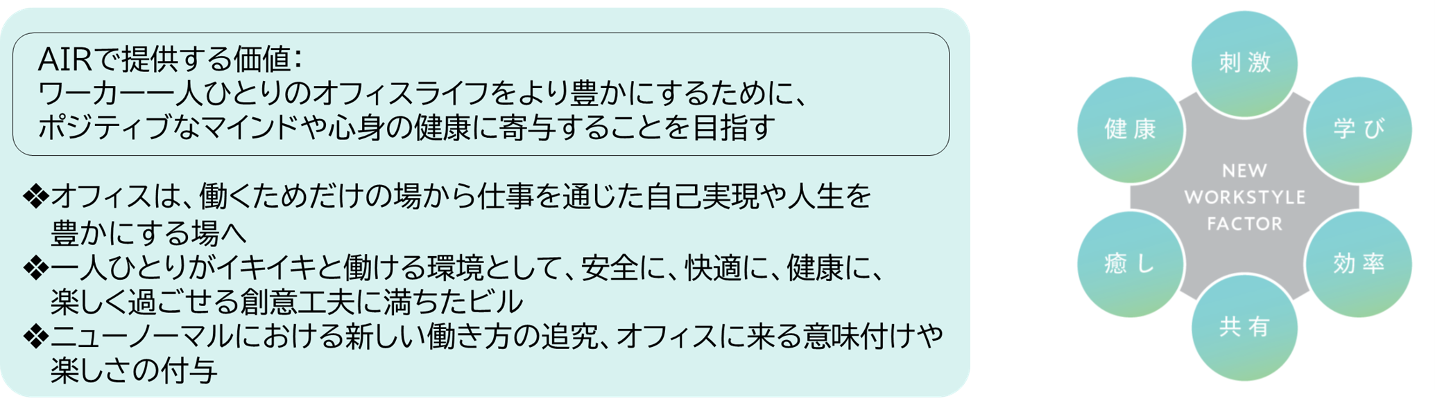新型コロナウイルス流行前から、赤坂インターシティAIRでは館内コンサートやマルシェ、クラフト系イベント、アウトドアのワークスペース、ビアフェス、花絵等様々な取り組みを実施してきました。入居テナントとの共催イベントや、住民参加や地元の銘菓店とのタイアップ等の、地域に根差した活動も行ってきました。今までのビルの取り組みやテナントアンケート結果も参考に、新たなワークスタイルの6要素を抽出してコンセプトを確立しました。