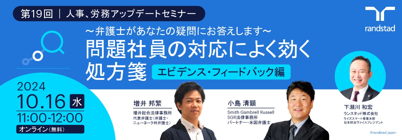 組織の規模にかかわらず、何らかの問題行動を起こしてしまう社員への対応を迫られる可能性があります。社員の問題行動を認識しながらも組織として適切な指導や対処ができなければ、他の社員のパフォーマンス低下や、職場環境の悪化だけにとどまらず、生産性低下や将来を担う社員の退職など、企業価値を損ねる様々な原因にもなりかねません。ランスタッドの「人事、労務アップデートセミナー」は、この悩ましい問題を2023年10月(第12回)より取り上げており、毎回、日米の法律を知る弁護士の先生方が実践的な対処方法を伝授しています。