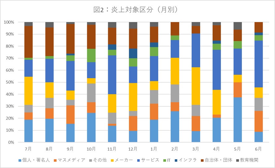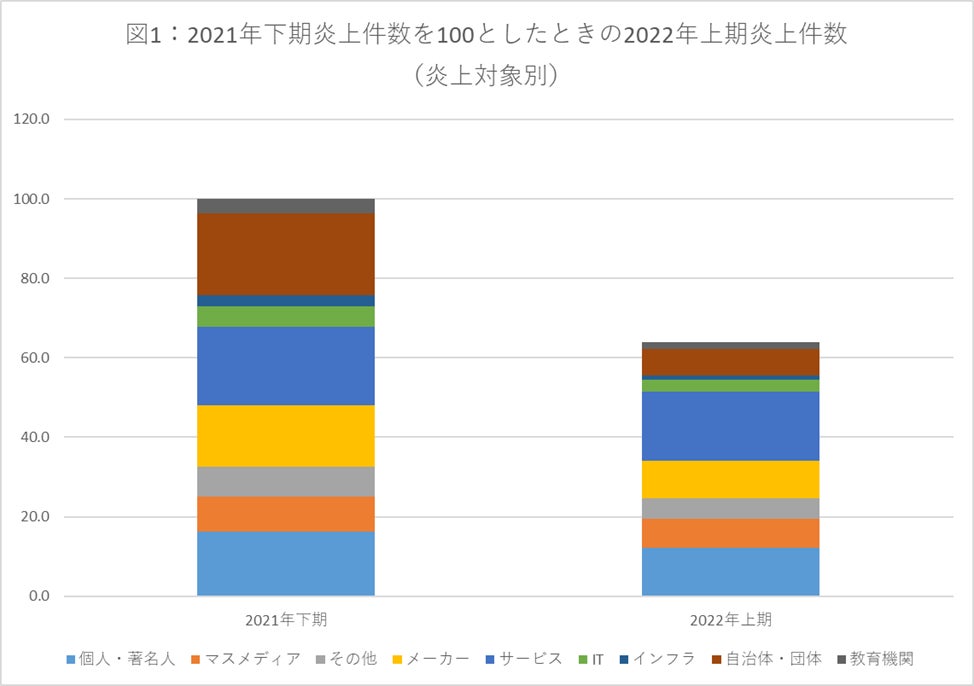 図2は、2021年下期と2022年上期の炎上件数を月次で炎上対象別に整理したものです。