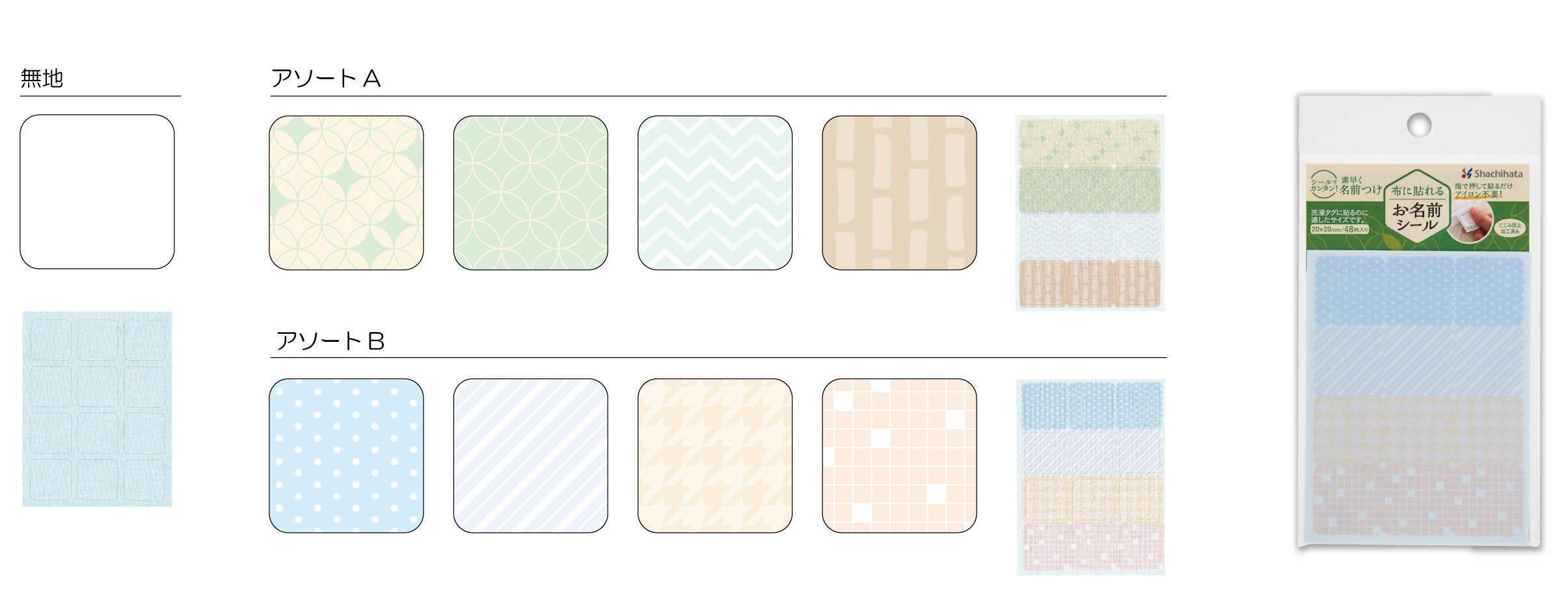 シールのサイズは、20×20㎜で洗濯タグにぴったり収まるサイズです。名前が記入しづらい衣類にも洗濯タグに貼るだけで簡単に名前付けができます。48枚入りのためたくさんの持ち物への名前付けが可能です。