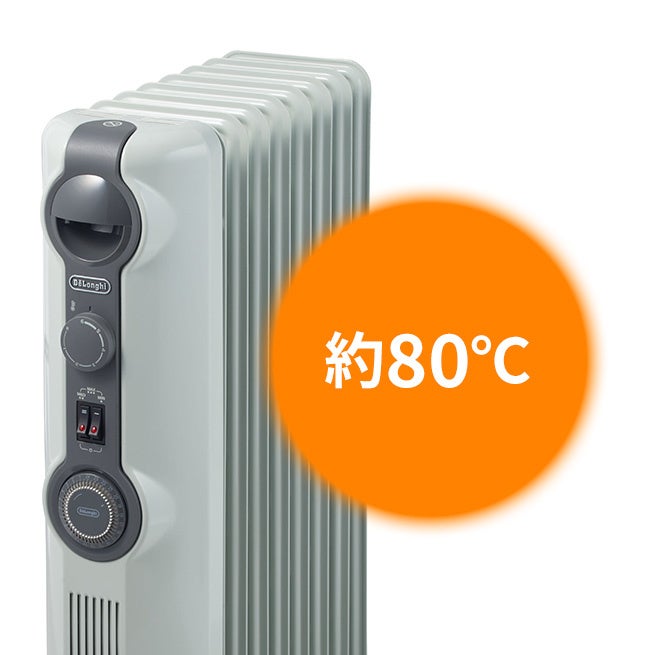 デロンギのオイルヒーターの特徴である「ゼロ風暖房」で、肌も喉も乾燥しにくく、温風でホコリやペットの毛を巻き上げないのでお部屋の空気を汚さず清潔に保つことができます。また、熱を放射して部屋全体をムラなく暖める輻射熱(ふくしゃねつ)暖房で、部屋の床・壁・天井まで暖めるので、5分程度換気をしても暖かさが続きます。さらに、やけどしにくい安全設計の「サーマルカットフィン」や、30分ごとにオン/オフの設定が可能な24時間電子タイマーが備わっており、安全性と操作性を両立したオイルヒーターです。