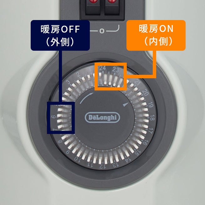 ヒーターをオンにしたい時間帯はピンを内側に押し込み、オフにするにはピンを外側に移動させるだけの簡単設定。生活スタイルに合わせて、オン/オフを何度でも設定できるタイマーです。