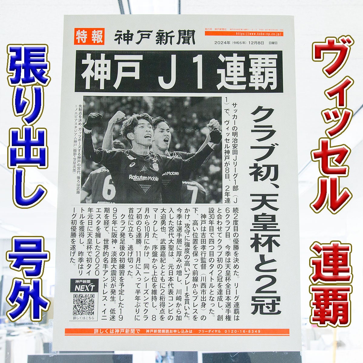 神戸新聞ECサイト「いいモノがたり」からのご予約限定で、特別な特典をご用意しました。ECサイトを通じて申し込まれた方には、2024年のJ1連覇時に掲出された張り出し号外をプレゼントします。