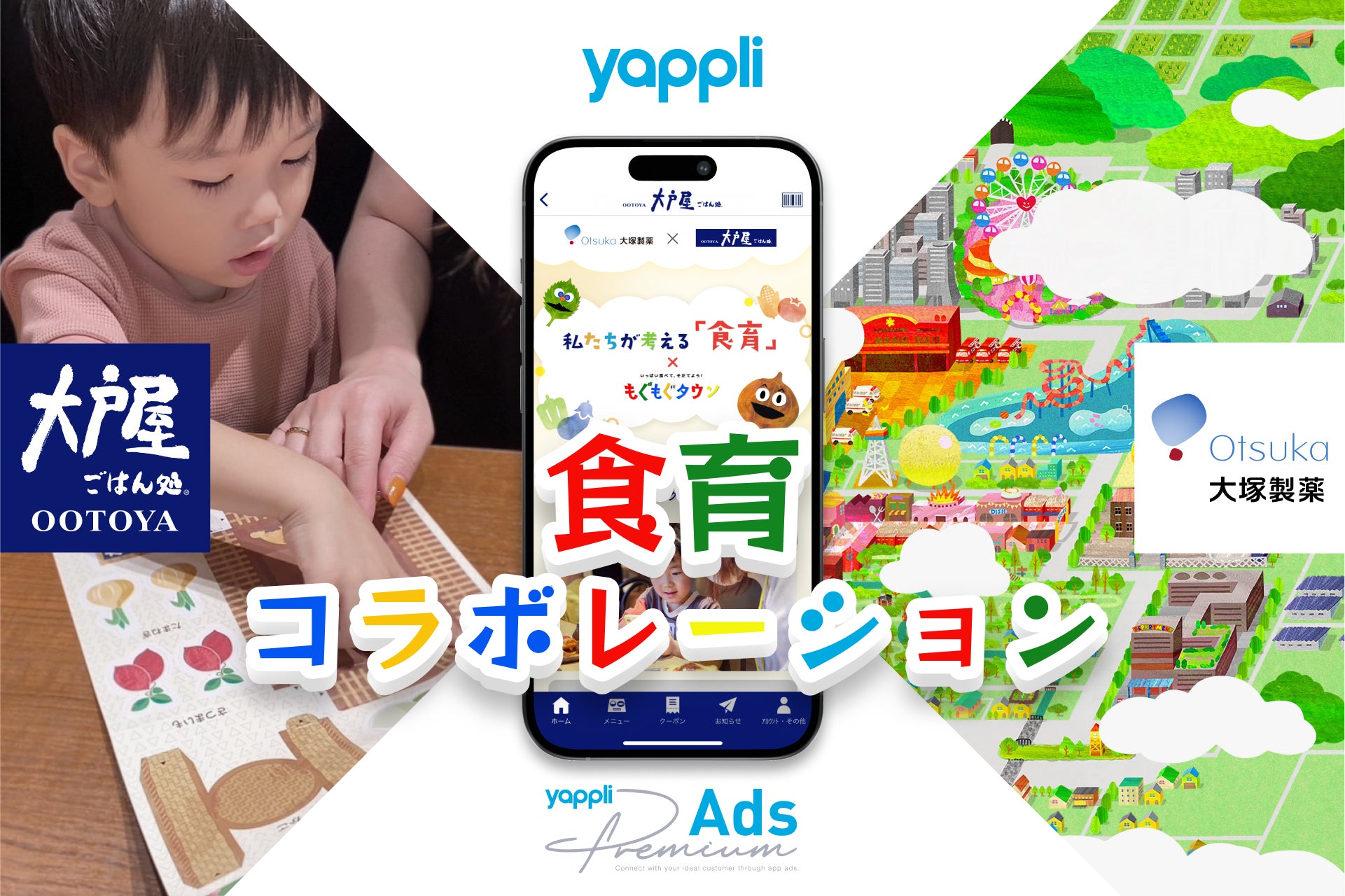 具体的な施策として、大戸屋アプリに「Yappli Premium Ads」を通じて大塚製薬が本年2月より公開している食育ゲームアプリ「もぐもぐタウン」をコンテンツのひとつとして掲載。身近なアプリを活用し、来店時だけでなく、自宅や隙間時間でも楽しく継続的に親子でコミュニケーションをとりながら食や栄養について学ぶことができます。