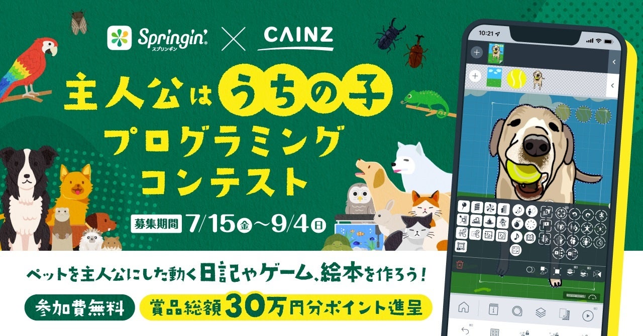 本コンテストは、こうしたカインズの思いに賛同をいただいた、「しくみでみんなを笑顔にする」をビジョンに掲げるクリエイティブカンパニーの株式会社しくみデザイン※1とともに、ペットを主人公にしたプログラミング作品の作成を通じて、ペットとのくらしをより豊かなものにし、一からものをつくることの楽しさと喜びを感じていただくことを目的に開催するものです。スマートフォンやタブレットで簡単にゲームなどのデジタル作品を作って共有できるアプリ「スプリンギン」を使って、ペットを主人公にした作品を応募いただきます。