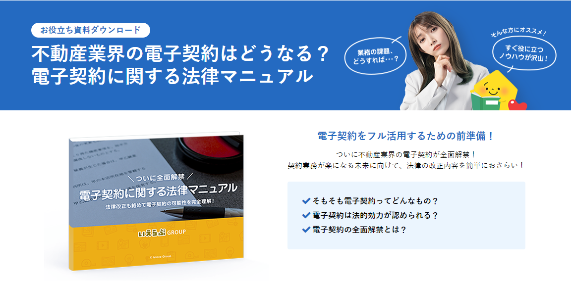 いえらぶGROUPでは、昨年より、法改正に向けた電子契約法律マニュアルを作成し、HPや「いえらぶCLOUD」上で不動産会社に提供してきましたが、このたび、宅建業法の改正施行を受け、最新の宅建業法施行規則と、合わせて国土交通省より発表されたマニュアルに対応した内容に刷新し、公開いたしました。