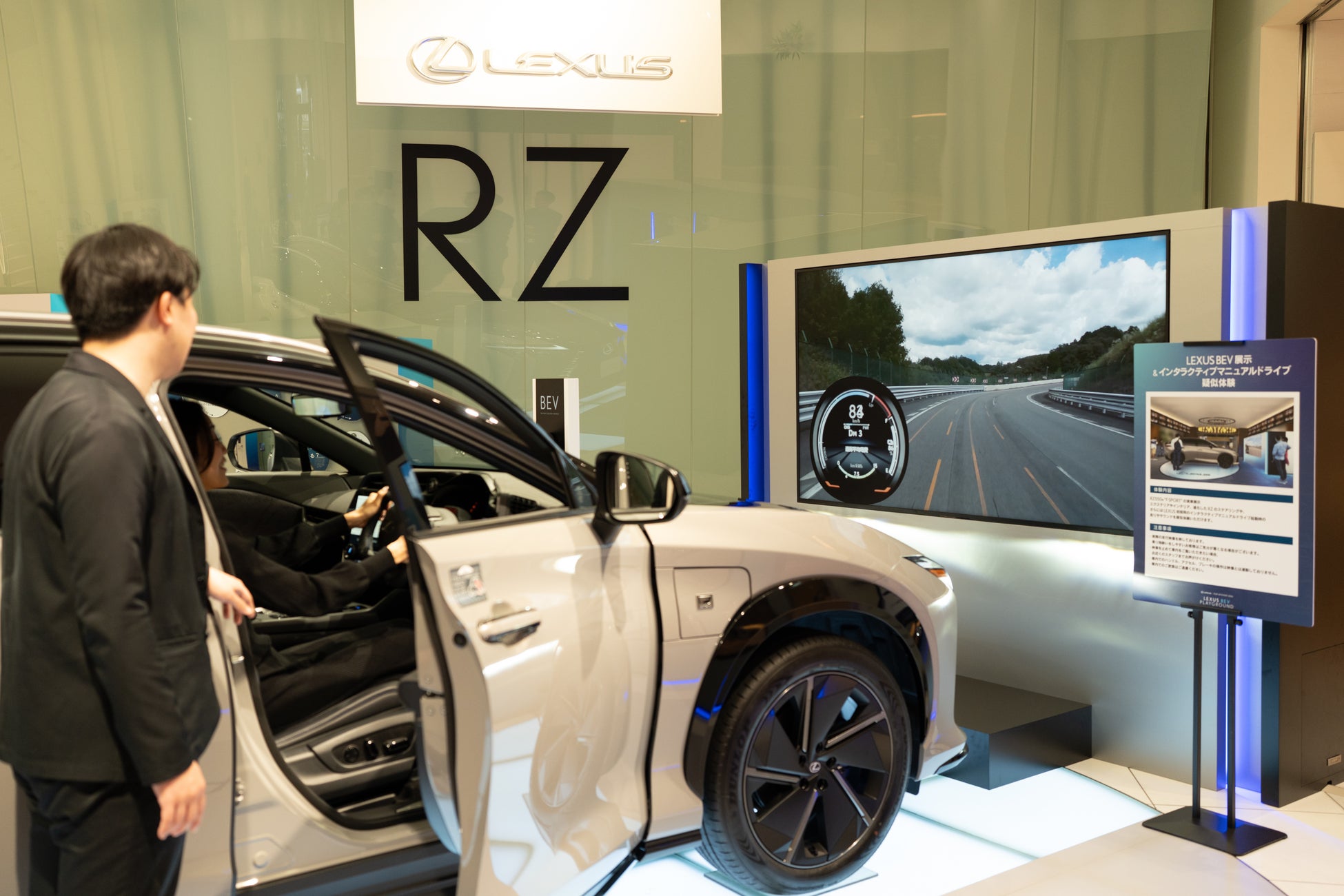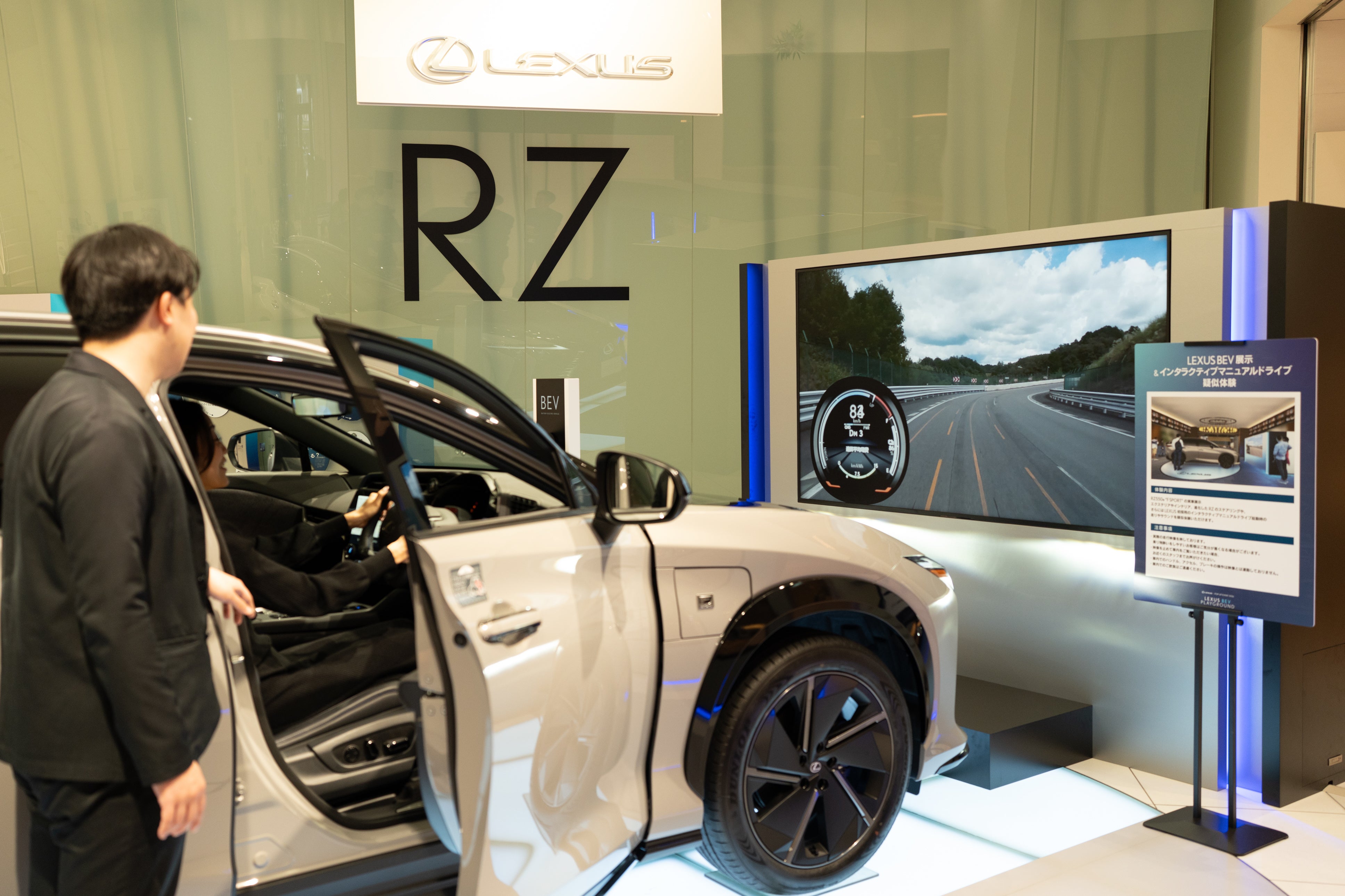 LEXUS RZ550eの展示車を会場に用意。エクステリアやインテリア、進化したRZのステアリングに見て触れることができます。またLEXUS初採用のインタラクティブマニュアルドライブ(IMD)を、映像・サウンドとともに疑似体験もできます。
