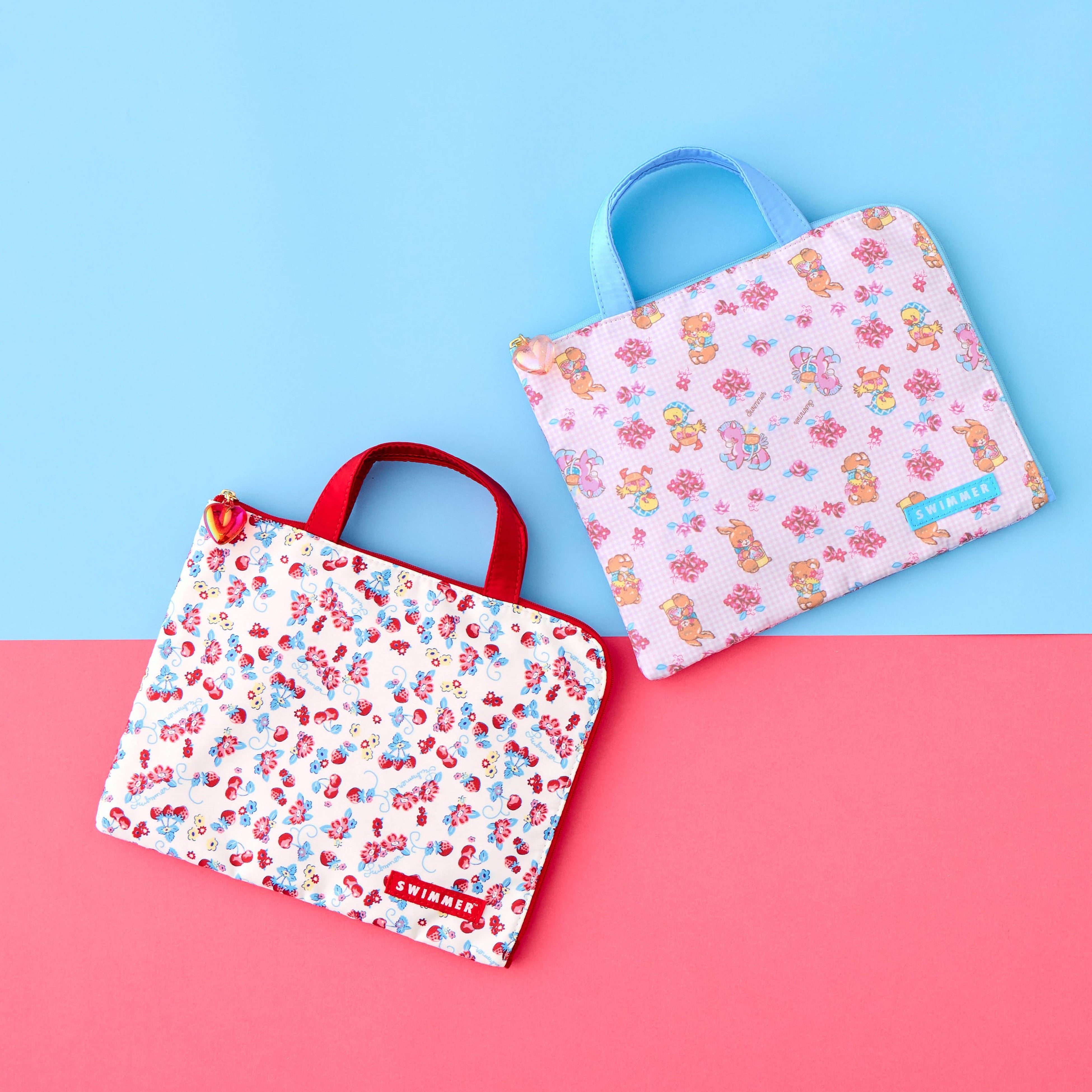 柄展開は全商品共通の「いちご」「アニマル」の2色展開。「いちご」は淡いベージュ地にいちごやさくらんぼなどの赤色が映える、かわいくてどこか懐かしい雰囲気があるデザインです。「アニマル」はピンクと白のギンガムチェックをベースに、スイマーらしいレトロな雰囲気の動物たちのイラスト等がちりばめられたノスタルジックでかわいいデザインになっています。