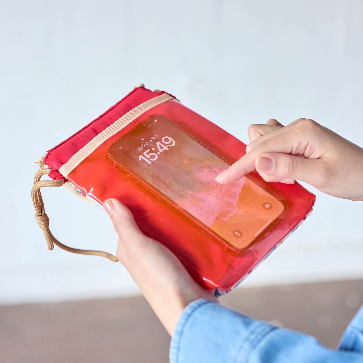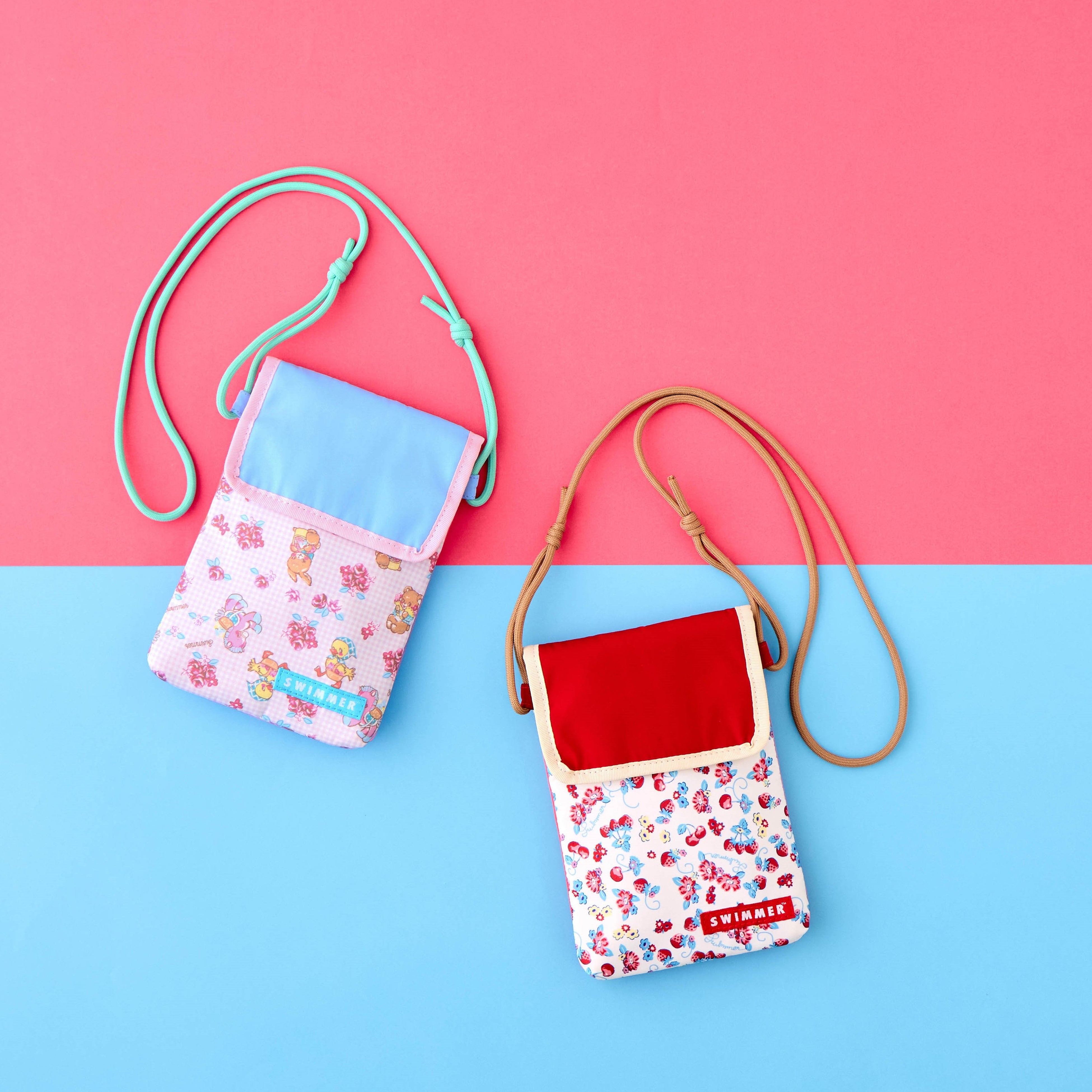 スイマーの総柄がかわいい、調節可能なショルダーストラップタイプのスマホポーチ。スマホの他に小銭・鍵なども持ち運べるようジッパーポケットを付けました。開閉しやすいマグネット仕様、スマホを入れたまま操作しやすい背面ポケット付きで実用性も抜群。親子でお揃いもおすすめ。